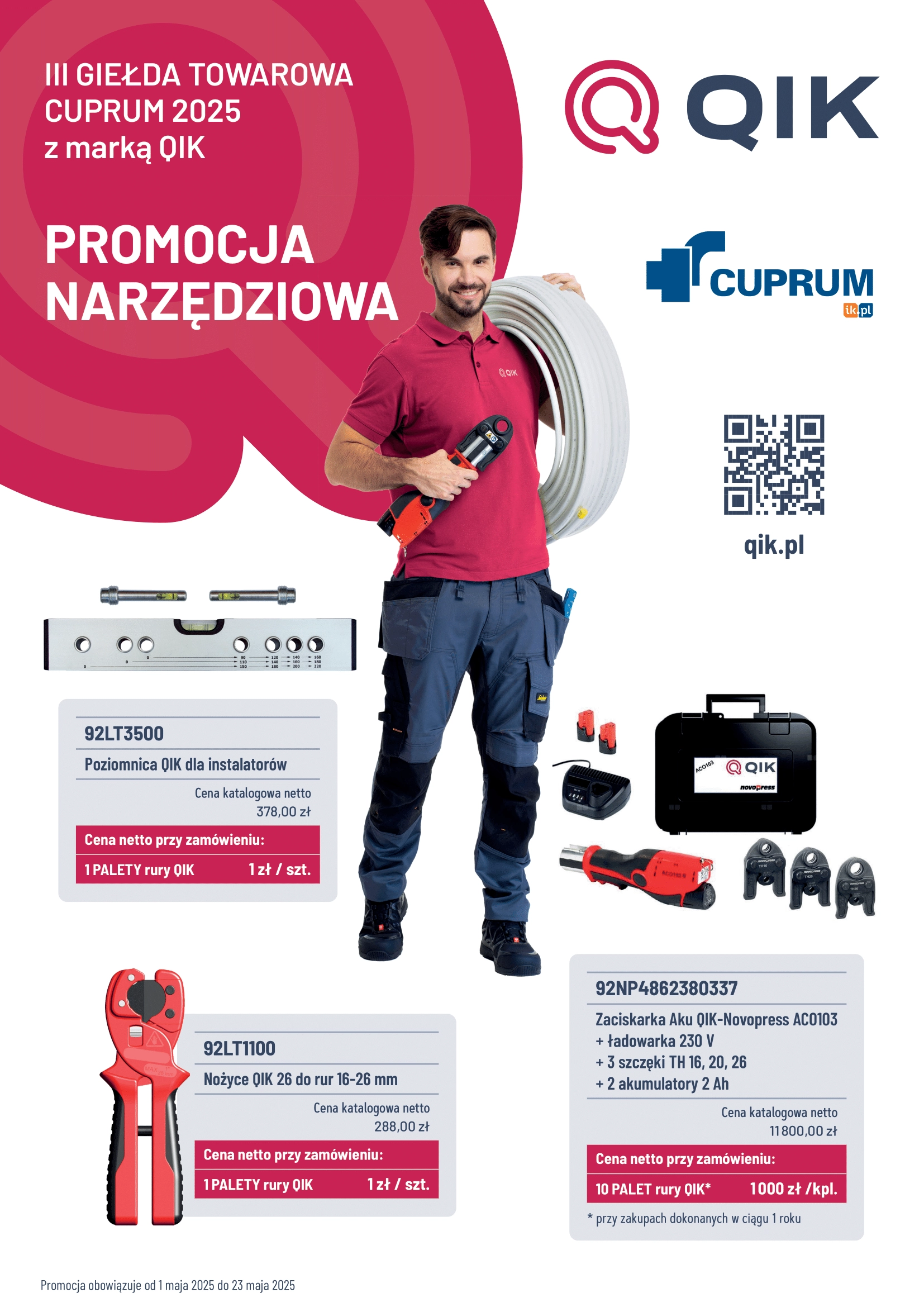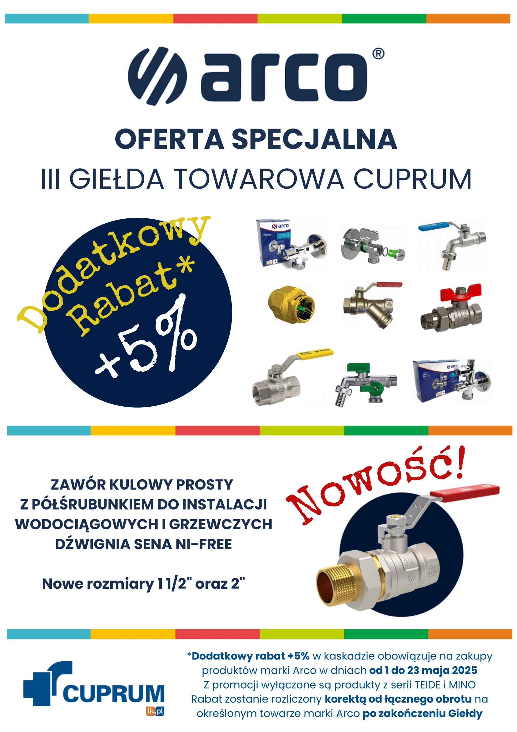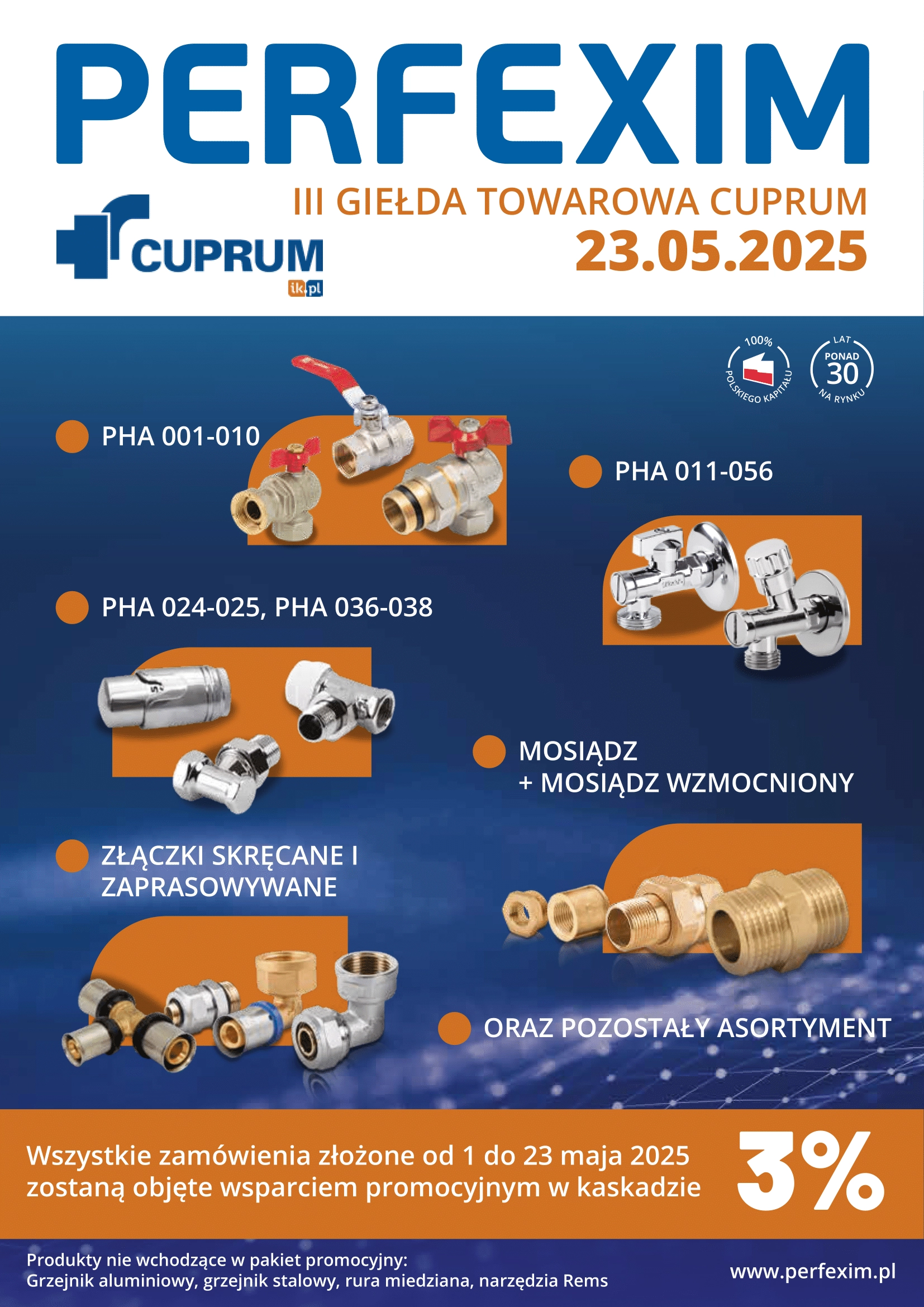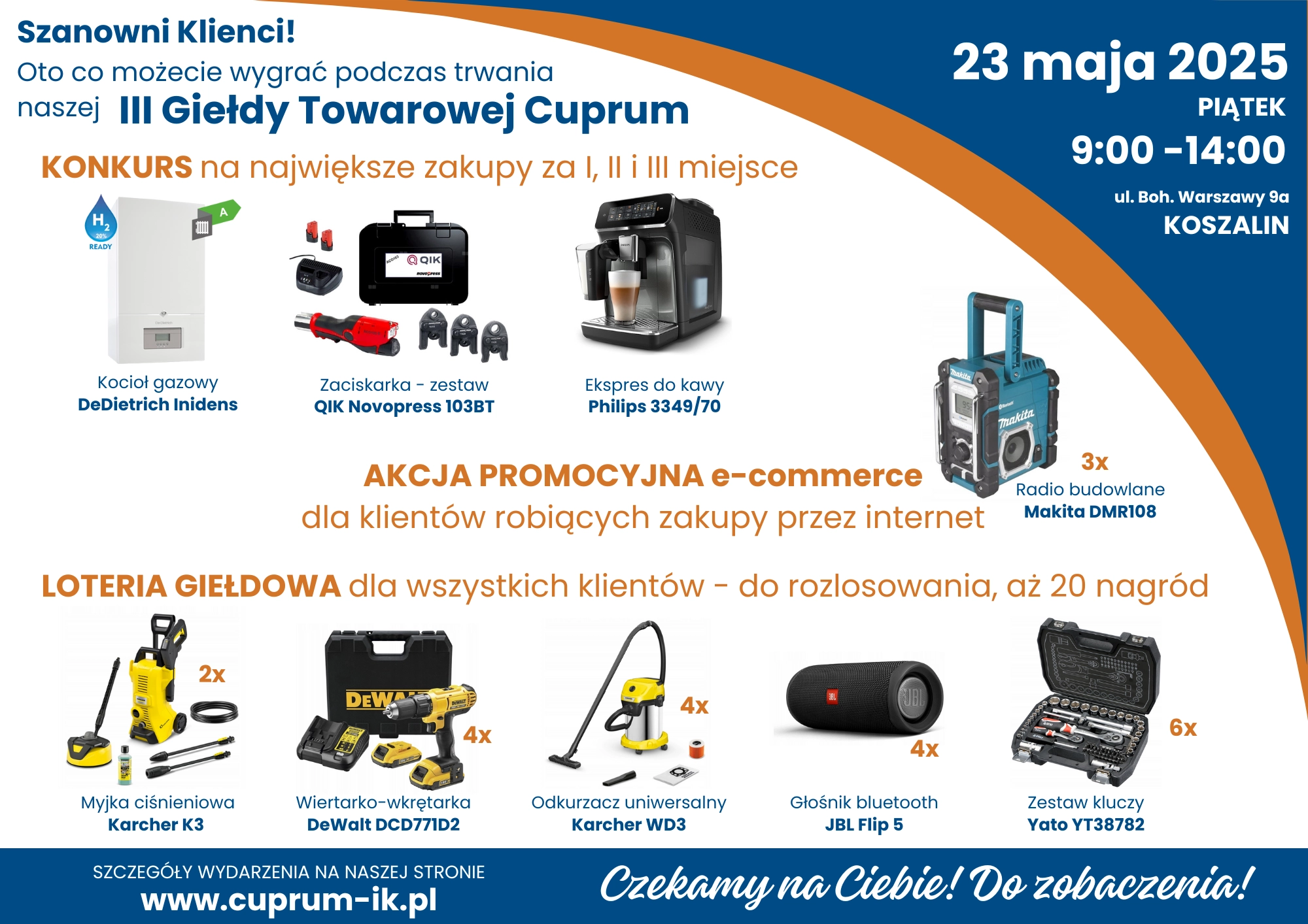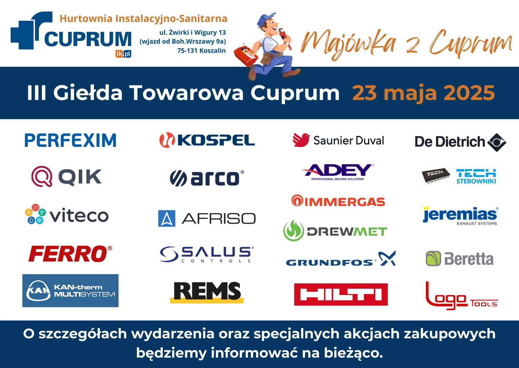 Zapisz w kalendarzu datę 23 maja 2025 r. (piątek) i dołącz do nas na III Giełdzie Towarowej CUPRUM! To wyjątkowa okazja, by zapoznać się z najnowszymi produktami branży instalacyjnej i skorzystać z atrakcyjnych ofert specjalnych.
