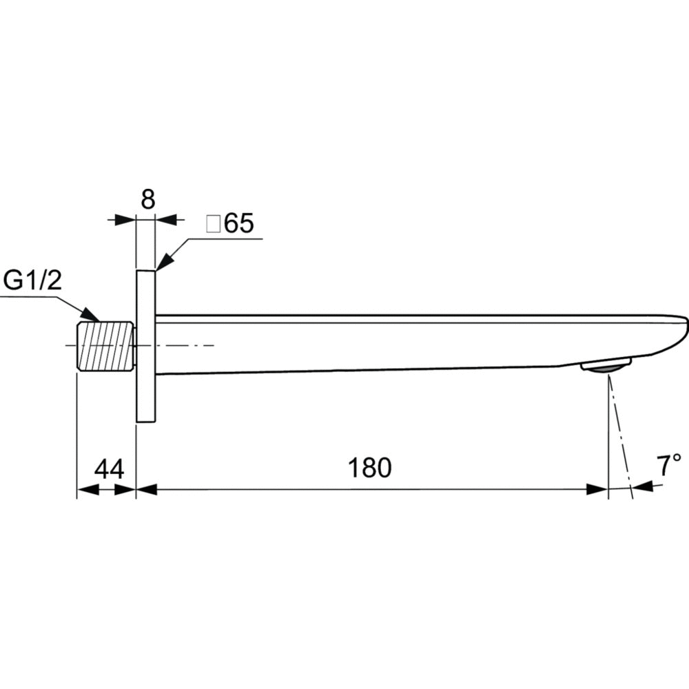 Wylewka długości 180 mm. Metalowa chromowana rozeta 65x65 mm z logo Ideal Standard. Aerator M24x1. Podłączenie G1/3.