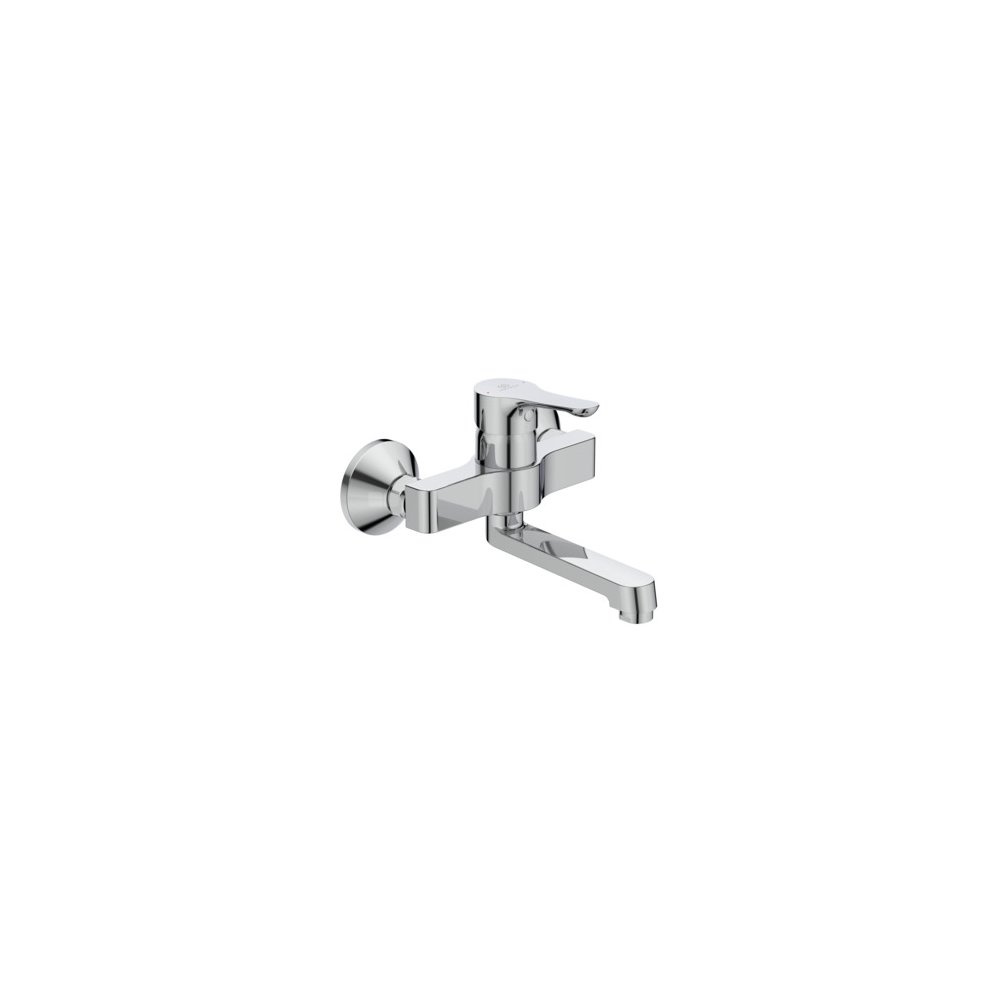 Bateria umywalkowa ścienna. Głowica ceramiczna 35 mm z ogranicznikiem temperatury. Metalowy uchwyt z nadrukowanymi czerwonymi i niebieskimi oznaczeniami. Aerator typu Perlator. Standardowe przyłącza mimośrodowe.
