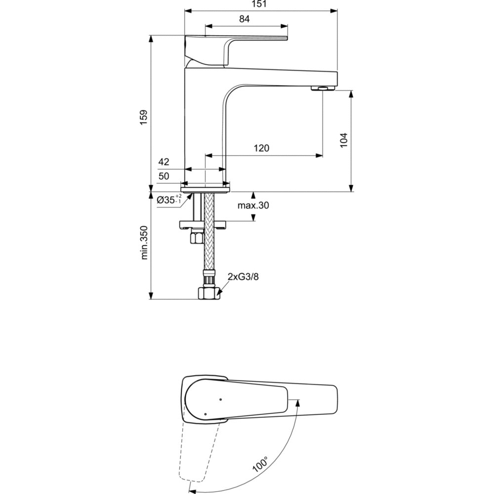 Głowica ceramiczna 28 mm z ogranicznikiem temperatury wody. Metalowy uchwyt z oznaczeniem wody ciepłej i zimnej. Aerator typu Perlator z ogranicznikiem przepływu wody do 5 l/min. Technologia BlueStart® - uchwyt na wprost - przepływ wody wody zimnej. Bateria typu GRANDE, z wyższym korpusem i dłuższą wylewką. Wysokość od przepływ wodyu wody do podstawy baterii H105. System montażu EASY-FIX. Wężyki przyłączeniowe G3/8". Zgodność z EN817.