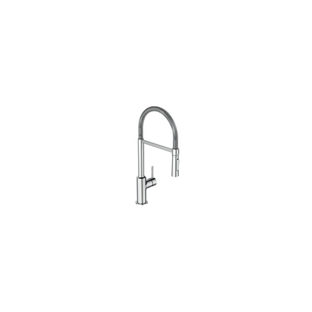 Bateria kuchenna stojąca typu SEMI PRO. Wysoka, elastyczna 2-funkcyjna wylewka z ramieniem stabilizującym. Metalowy uchwyt z nadrukowanymi czerwonymi i niebieskimi oznaczeniami. Ukryty aerator. Głowica ceramiczna 35 mm. Wężyki przyłączeniowe G3/8”. System montażu Easy-Fix. W kompaktowym pudełku.