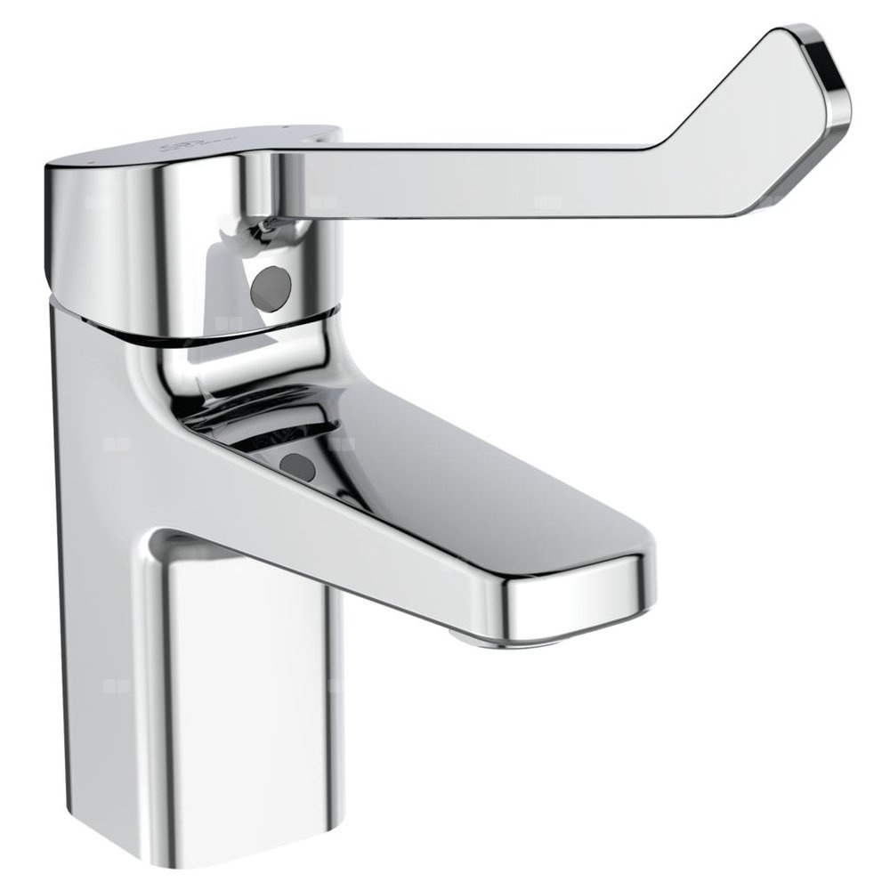 Bateria umywalkowa stojąca. Jednootworowa z obszarem Comfort pod aeratorem: 75 mm. Innowacyjna ceramiczna głowica FirmaFlow 38 mm z ogranicznikiem temperatury. Metalowy uchwyt medyczny z nadrukowanymi czerwonymi i niebieskimi oznaczeniami. Smukły aerator z ogranicznikiem przepływu wody do 5 l/min. System montażu Easy-Fix. Wężyki przyłączeniowe G3/8”. Metalowy korek automatyczny.