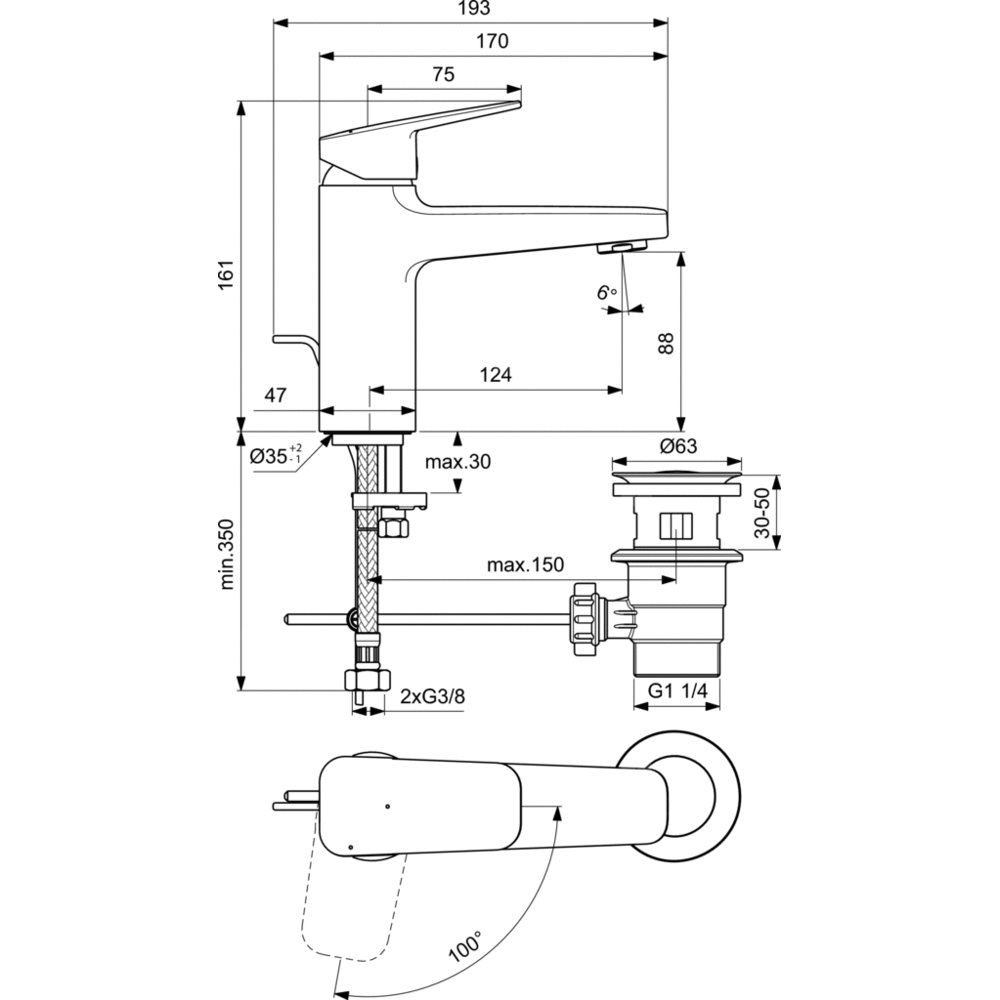 Bateria umywalkowa stojąca. Jednootworowa z obszarem Comfort pod aeratorem: 90 mm. Innowacyjna ceramiczna głowica FirmaFlow 38 mm z ogranicznikiem temperatury. Metalowy uchwyt z nadrukowanymi czerwonymi i niebieskimi oznaczeniami. Smukły aerator z ogranicznikiem przepływu wody do 5 l/min. System montażu Easy-Fix. Wężyki przyłączeniowe G3/8”. Plastikowy korek automatyczny. Technologia Blue Start.