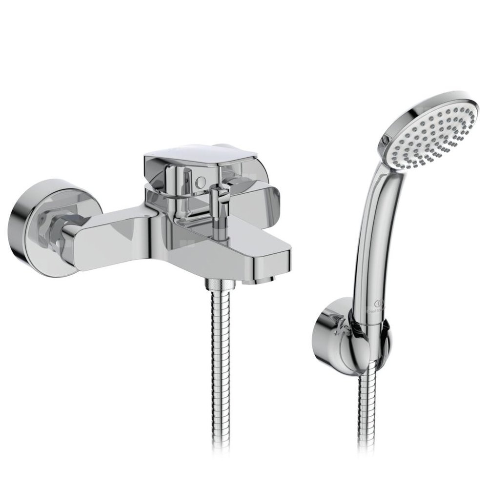 Innowacyjna ceramiczna głowica FirmaFlow®, 38 mm, z funkcją. ograniczenia temperatury wody. Metalowy uchwyt z oznaczeniem wody: ciepła/zimna. Przełącznik automatyczny wanna/natrysk. Zawór zwrotny. Przyłącza mimośrodowe. Metalowe rozety maskujące. Jednofunkcyjna słuchawka prysznicowa. Uchwyt ścienny do słuchawki prysznicowej. Metalowy wąż natryskowy, 1500 mm .
