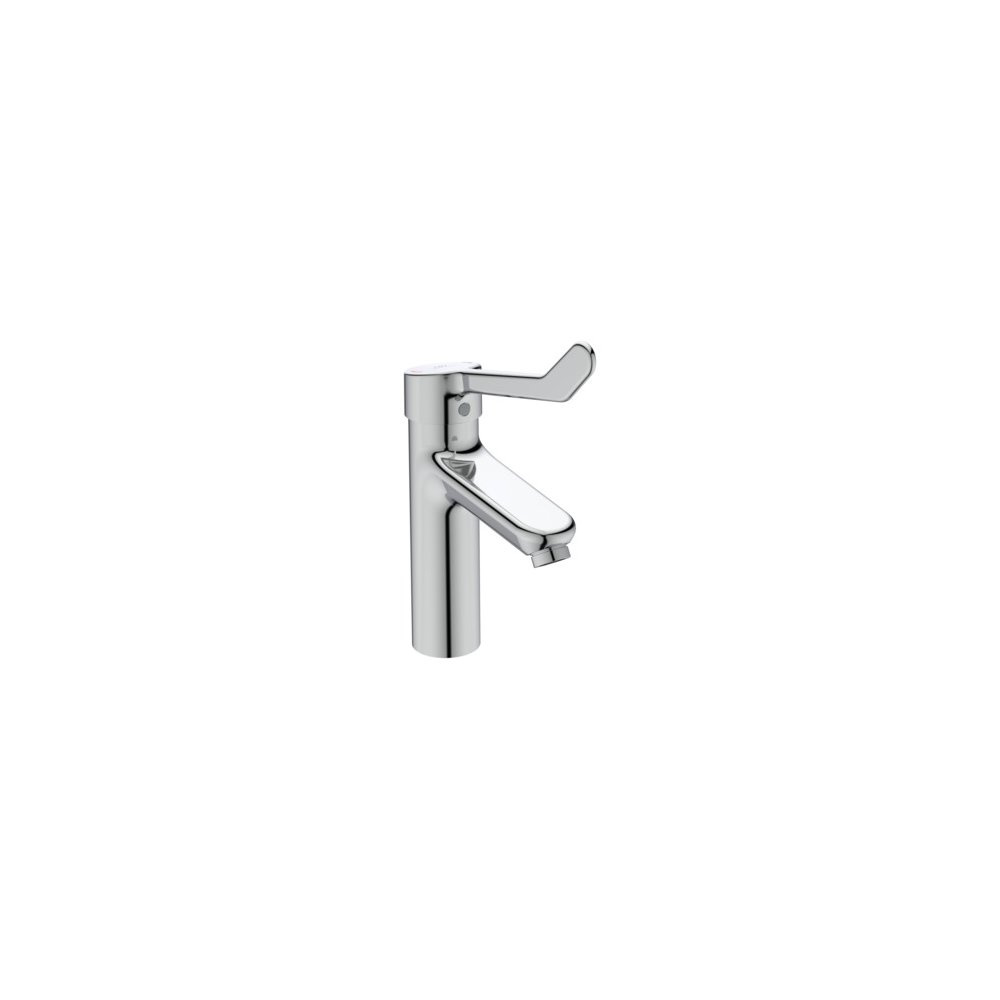 Odlewany korpus z wylewką zapewniającą samoczynny odpływ wody. Metalowy uchwyt medyczny dł. 160 mm. z nadrukowanymi czerwonymi i niebieskimi oznaczeniami. Bez metalowego korka automatycznegoWandaloodporny aerator ograniczający napowietrzenie strumienia wody. Ogranicznik przepływu w głowicy do 8,4 l/min. Wężyki przyłączeniowe PEX G3/8". Głowica ceramiczna 38 mm z ogranicznikiem temperatury. System montażu EASY-FIX. Klasa akustyczna 1. Zgodna z EN817. Wszystkie materiały w baterii które mają kontakt z wodą pitną są zgodne z wymaganiami KTW, ACS i WRAS.
