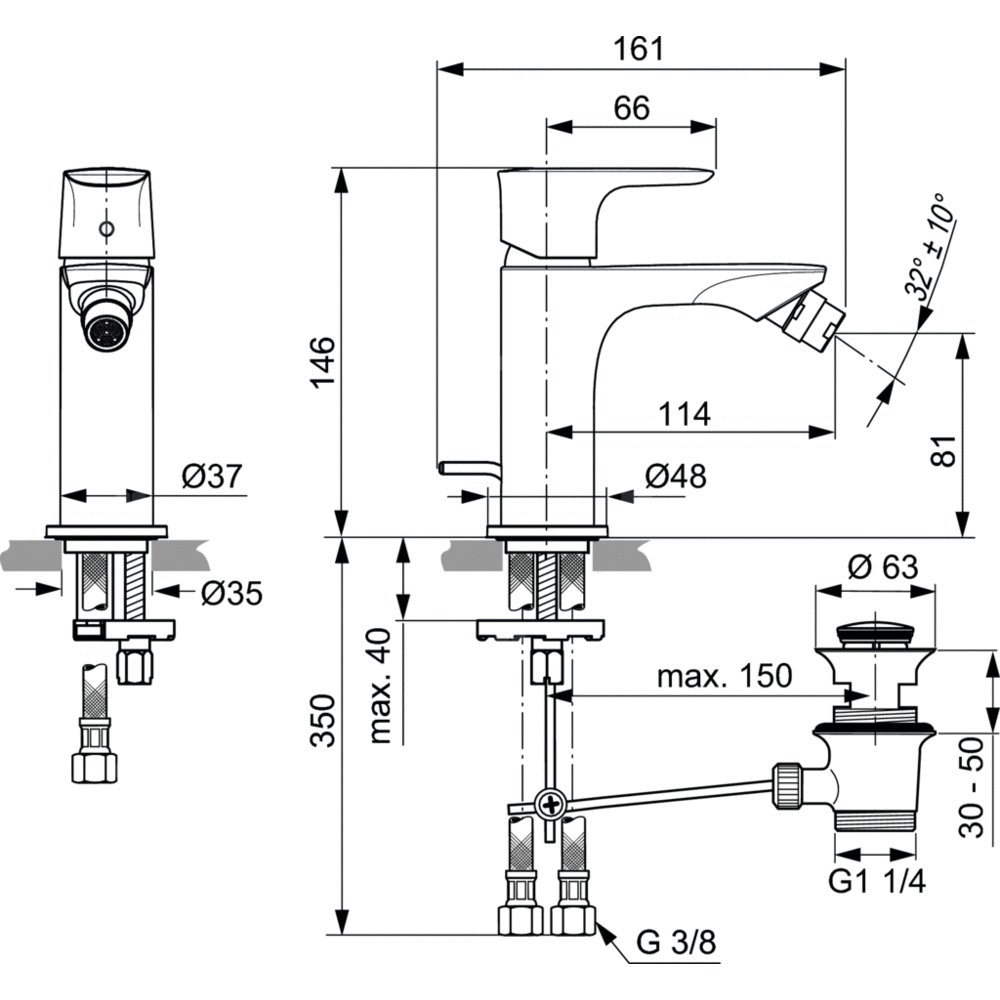Bateria bidetowa jednootworowa z korkiem automatycznym. Smukły, mosiężny, odlewany korpus. Metalowy uchwyt z nadrukowanymi czerwonymi i niebieskimi oznaczeniami. Elastyczne wężyki przyłączeniowe PEX G3/8". Perlatorator typu Ball-joint M18x1 - 5l/min. Głowica ceramiczna 25 mm bez ogranicznika temperatury. Metalowy korek automatyczny, brak funkcji Click.