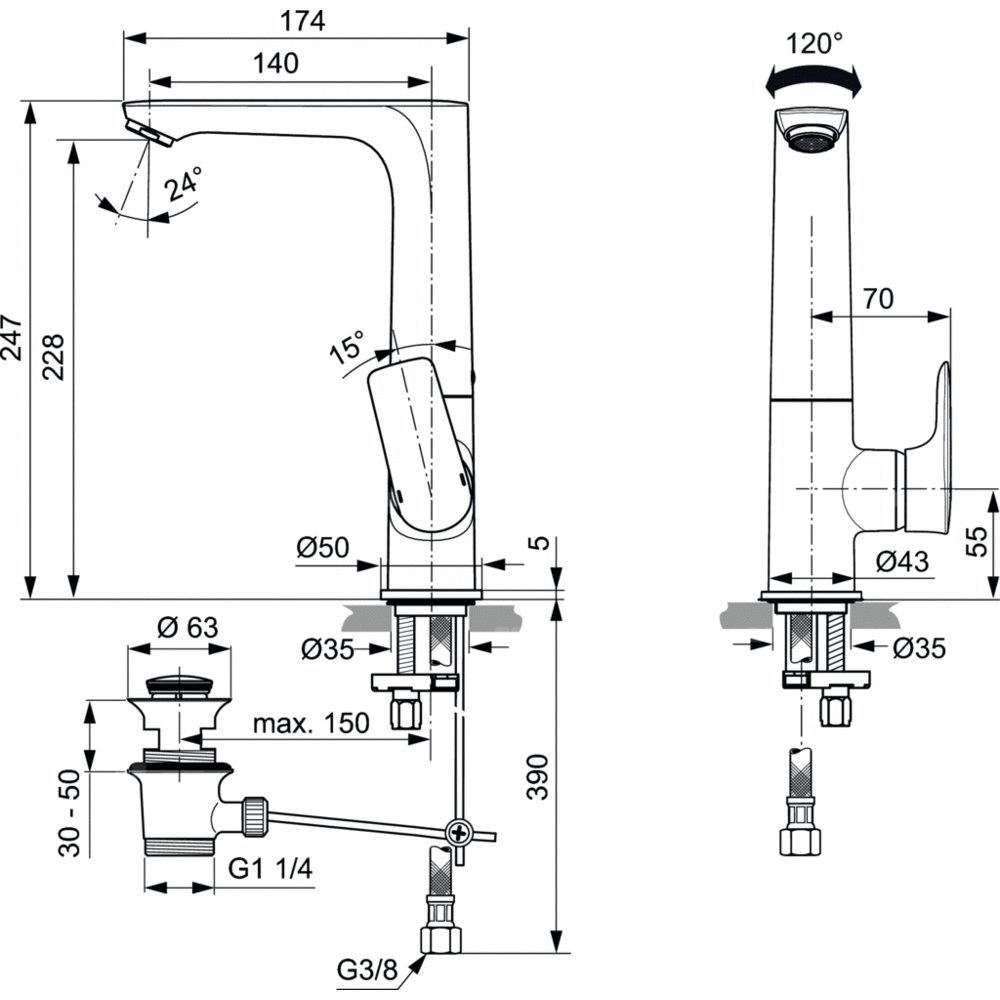 Bateria umywalkowa Grande z metalowym automatycznym korkiem. Smukły metalowy korpus. Obrotowa kwadratowa wylewka 120°. Metalowy uchwyt z nadrukowanymi czerwonymi i niebieskimi oznaczeniami. Aerator typu Perlator M24x1 - 5l/min, ogranicznik ciepłej wody - oddzielnie w opakowaniu. Głowica 28 mm, brak funkcji Click. Wężyki przyłączeniowe PEX G3/8".