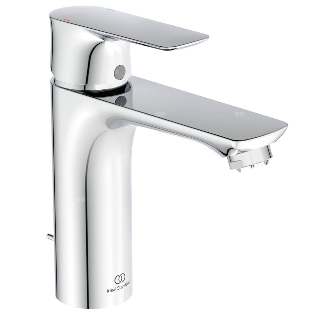 Bateria umywalkowa jednootworowa Grande do niskiego ciśnienia ND. Metalowy korek automatyczny, mosiężny, odlewany korpus 48 mm. Metalowy uchwyt z nadrukowanymi czerwonymi i niebieskimi oznaczeniami. Mocowanie uchwytu przedniego. Chromowany przycisk. Przepływ M24x1 do niskiego ciśnienia, głowica FirmaFlow 38 mm z ogranicznikiem temperatury. Bez funkcji Click. Elastyczne wężyki przyłączeniowe PEX G3/8" (3 szt.).