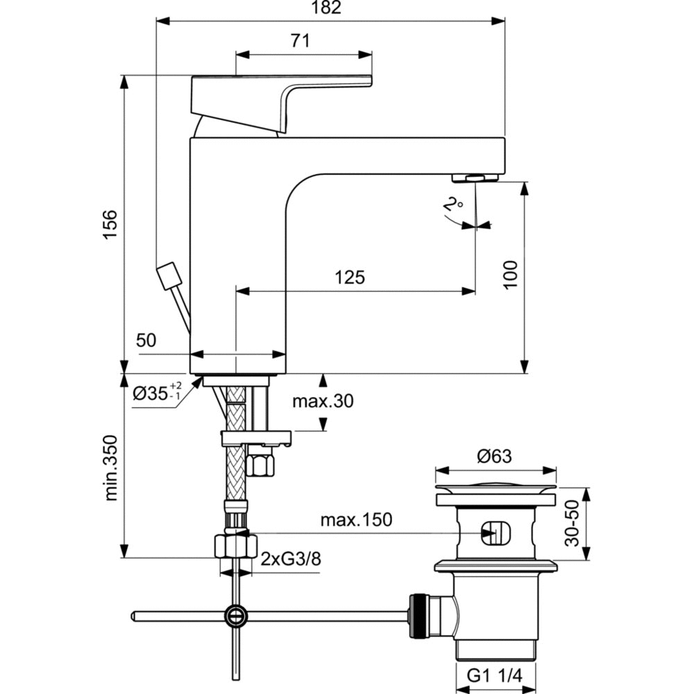 Bateria umywalkowa z metalowym korkiem automatycznym. Głowica FirmaFlow ISI 38 mm z ogranicznikiem temperatury. Metalowy uchwyt z logo Ideal Standard oraz nadrukowanymi czerwonymi i niebieskimi oznaczeniami. Aerator typu Perlator M24x1 - z ogranicznikiem przepływu wody do 5l/min. Klasa akustyczna 1. Wężyki przyłączeniowe PEX G3/8". System montażu EASY-FIX. Zgodna z EN817.