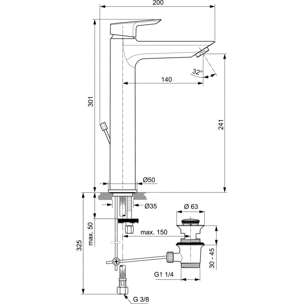 Bateria umywalkowa nablatowa Tesi z metalowym automatycznym korkiem. Głowica ceramiczna IS 28 mm z ogranicznikiem temperatury. Mosiężny, odlewany korpus. Metalowy uchwyt z nadrukowanymi czerwonymi i niebieskimi oznaczeniami. Perlator typu Cascade z ogranicznikiem przepływu wody do 5 l/min. Wężyki przyłączeniowe G3/8". System montażu EASY-FIX. Metalowy pierścień.