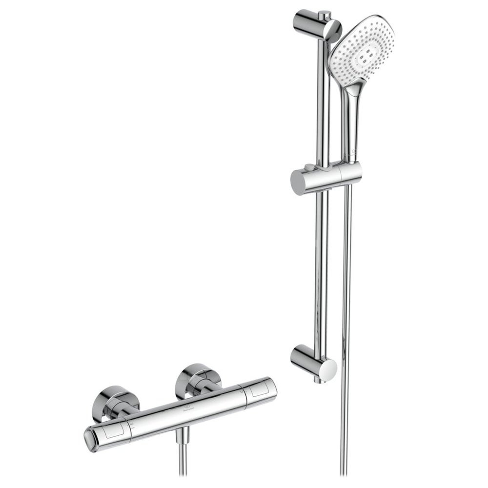 Bateria termostatyczna natryskowa naścienna z akcesoriami. Ukryte przyłącza mimośrodowe. Głowica termostatyczna IS nowej technologii. Ceramiczny zawór G1/2 180°. Diamentowy uchwyt z ogranicznikiem temperatury do 40°C i przyciskiem redukującym przepływ wody o 50%. Zawór zwrotny. W komplecie zestaw natryskowy: słuchawka natryskowa 125 mm 3-funkcyjnaEvo Jet Diamond, z ogranicznikiem przepływu 8l/min, wąż natryskowy 1750 mm Idealflex oraz drążek natryskowy 600 mm z regulacją punktów mocowania do ściany. Zalecane dodatkowe elementy: nakładana półka do baterii termostatycznych Ceratherm T25, T50 i T100 A7215AA.