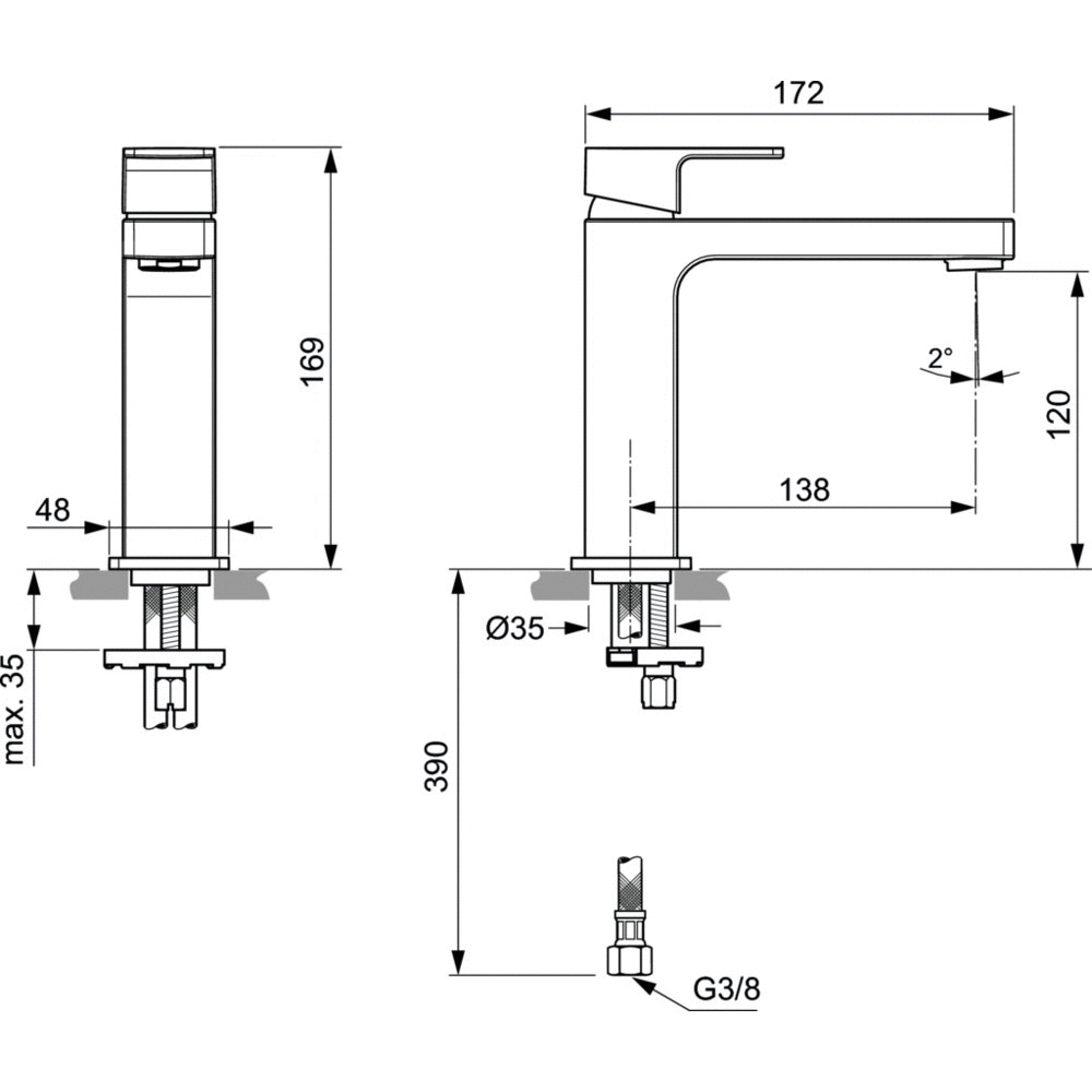 Bateria umywalkowa bez metalowego korka automatycznego. Głowica ceramiczna IS 28 mm. Metalowy uchwyt z logo Ideal Standard oraz nadrukowanymi czerwonymi i niebieskimi oznaczeniami. Aerator typu Perlator M24x1 - z ogranicznikiem przepływu wody do 5l/min. Metalowy pierścień uszczelniający. Klasa akustyczna 1. Wężyki przyłączeniowe PEX G3/8". System montażu EASY-FIX. Zgodna z EN817.