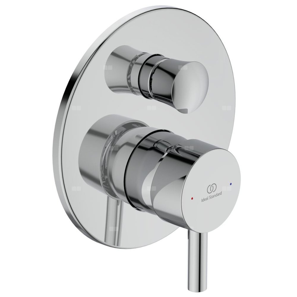 Zestaw montażowy baterii podtynkowej wannowo-natryskowej Ceraline. Głowica ceramiczna IS 47 mm CLICK. Metalowy uchwyt z nadrukowanymi czerwonymi i niebieskimi oznaczeniami. Okrągła rozeta. Automatyczny przełącznik. Do skompletowania z uniwersalnym zestawem podtynkowym EASY-BOX A1000NU.