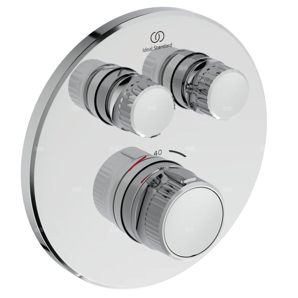 Zestaw montażowy podtynkowej baterii termostatycznej natryskowej Ceratherm Navigo. Bateria z dwomai przyciskami. Głowica FirmaFlow Therm z precyzyjną kontrolą temperatury. Uchwyt z ogranicznikiem temperatury do 40°C. Włączanie/wyłączanie odbywa się za pomocą wciskania przycisku a regulacja przepływu za pomocą obracania kolejnego. Smukła metalowa rozeta. Uszczelniony szyld pod rozetę izolujący wodę od ściany. Do skompletowania z zestawem A1000NU (część wewnętrzna).