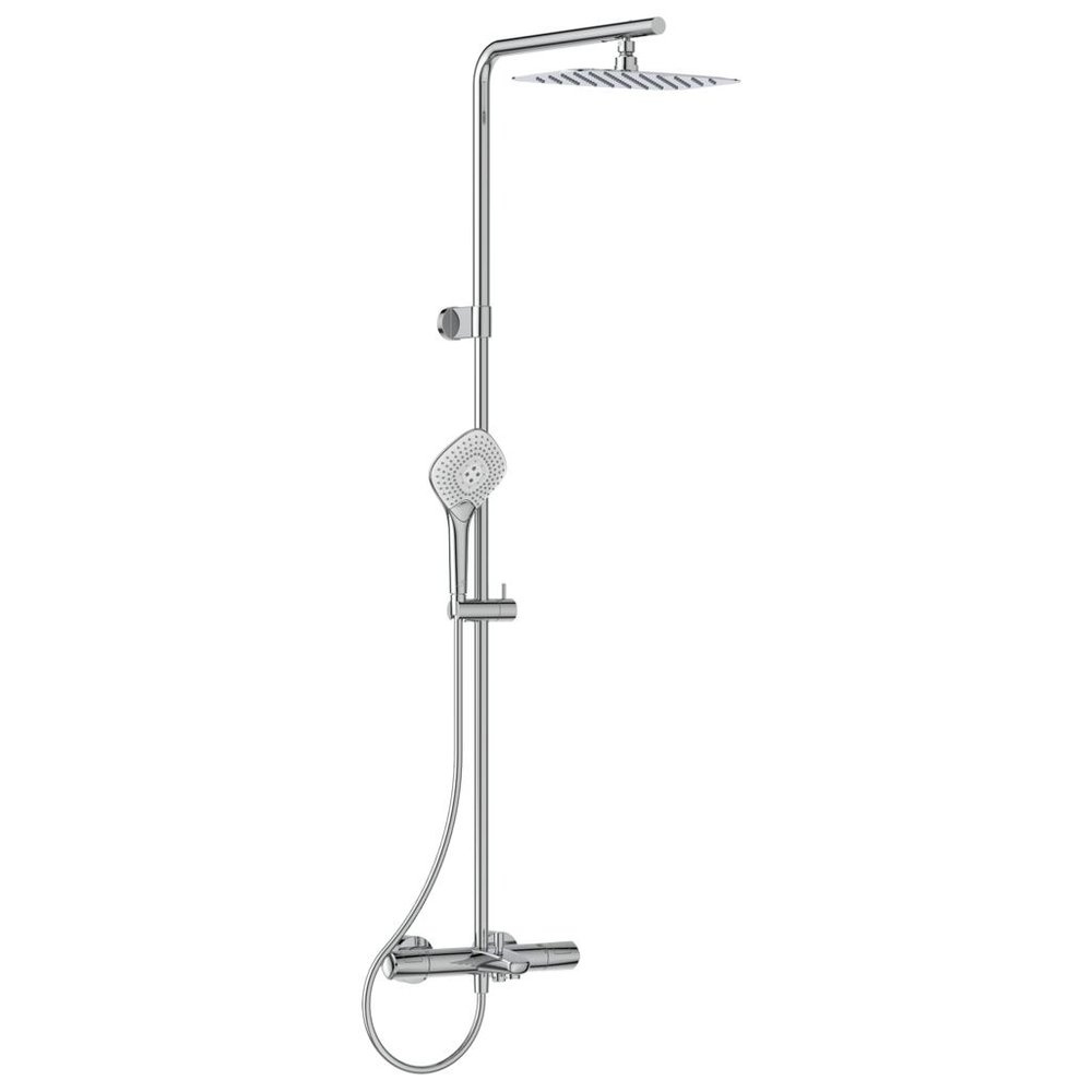 Zestaw natryskowy z baterią termostatyczną Ceratherm T100 wannowo-natryskową z regulacją poziomą i pionową. Ukryte przyłącza mimośrodowe. Głowica termostatyczna IS z ogranicznikiem temperatury. Ceramiczny zawór talerzowy włącz/wyłącz 180° i przyłączem gwint G1/2''. Zintegrowany przełącznik w uchwycie. Manualny przełacznik bateria/wanna. Wysokość drążka natryskowego do 300 mm (regulacja możliwa tylko podczas montażu). Pozioma rura z funkcją teleskopową do 100 mm (regulacja możliwa tylko podczas montażu). Uchwyt z ogranicznikiem temperatury do 40°C i przyciskiem redukującym przepływ wody o 50%. Zawory zwrotne.
