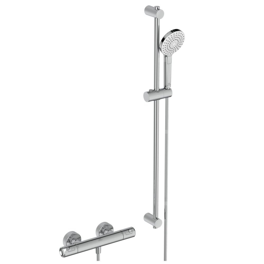 System natryskowy Ceratherm T50 natynkowy z akcesoriami. Standardowe przyłącza mimośrodowe. Głowica termostatyczna IS nowej technologii. Ceramiczny zawór G1/2 180°. Uchwyt z ogranicznikiem temperatury do 40°C i przyciskiem redukującym przepływ wody o 50%. Zawór zwrotny. W komplecie system natryskowy: słuchawka natryskowa 110 mm 3-funkcyjna Idealrain Evo Round, z ogranicznikiem przepływu 8l/min oraz wąż natryskowy 1750 mm Idealflex i drążek natryskowy 600 mm z regulacją punktów mocowania do ściany. Zalecane dodatkowe elementy: nakładana półka do baterii termostatycznych Ceratherm T25, T50 i T100 A7215AA.