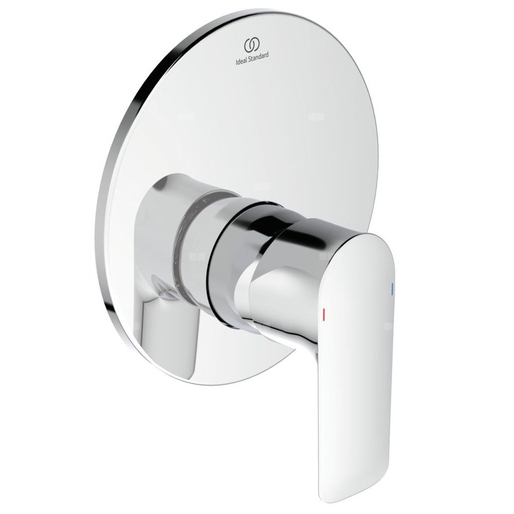 Zestaw montażowy podtynkowej baterii natryskowej. Głowica ceramiczna IS 47 mm. Metalowy uchwyt z nadrukowanymi czerwonymi i niebieskimi oznaczeniami, chromowana rozeta z tworzywa sztucznego. Do skompletowania z uniwersalnym zestawem podtynkowym A1000NU.