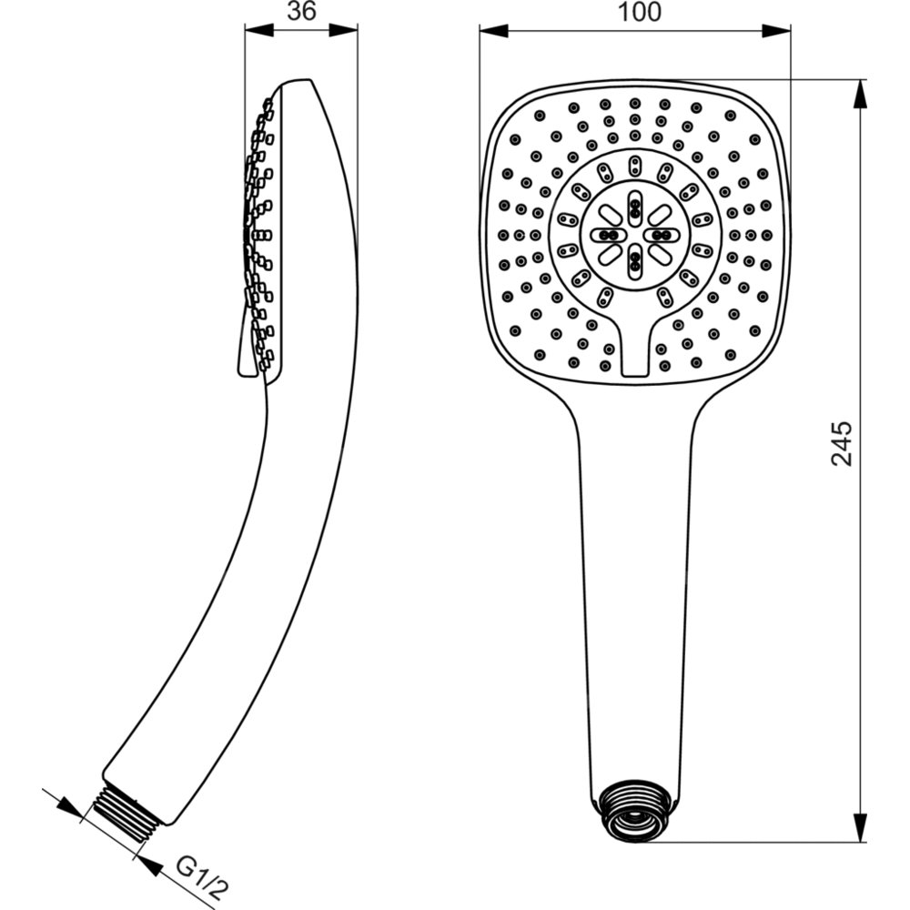 Słuchawka prysznicowa M3 trzyfunkcyjna, 100 mm. Gumowe końcówki dysz zapobiegające osadzaniu się kamienia. Ogranicznik przepływu wody do 8 l/min. Logo Ideal Standard, ręczna dźwignia prysznicowa.