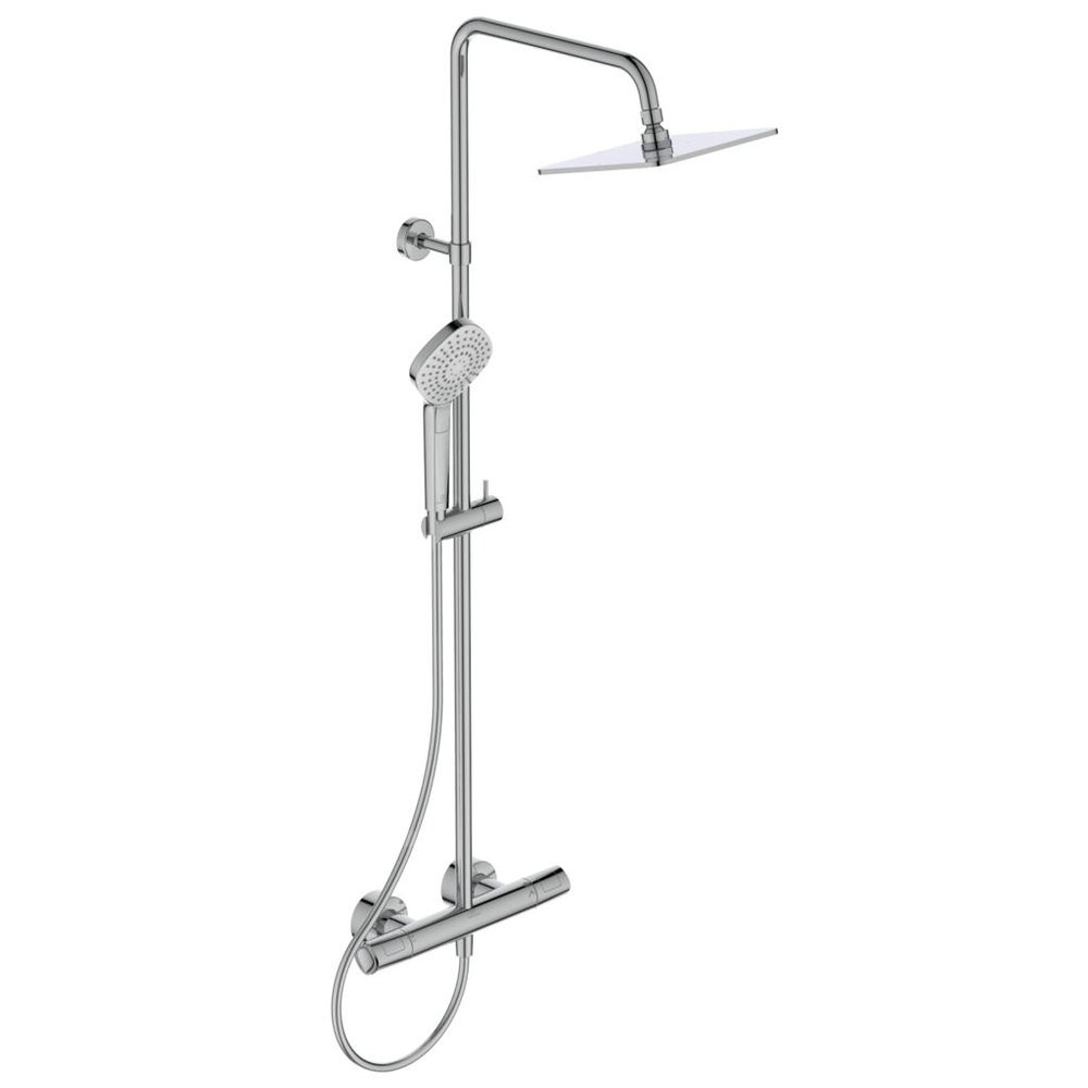 Bateria natryskowa naścienna z akcesoriami. Ukryte przyłącza mimośrodowe. Głowica termostatyczna IS nowej technologii. Ceramiczny zawór G1/2 180°. Diamentowy uchwyt z ogranicznikiem temperatury do 40°C i przyciskiem redukującym przepływ wody o 50%. Zawór zwrotny. W komplecie system natryskowy: deszczownica metalowa Ø200 mm, z ogranicznikiem przepływu 12 l/min, słuchawka natryskowa 110 mm 3-funkcyjna Idealrain Evo Round, z ogranicznikiem przepływu 8l/min, pozioma regulacja punktów mocowania do ściany oraz wąż natryskowy 1750 mm Idealflex. Zalecane dodatkowe elementy: przedłużenie do drążka natryskowego, 150 mm A861379AA lub przedłużenie do drążka natryskowego, 300 mm A861380AA.