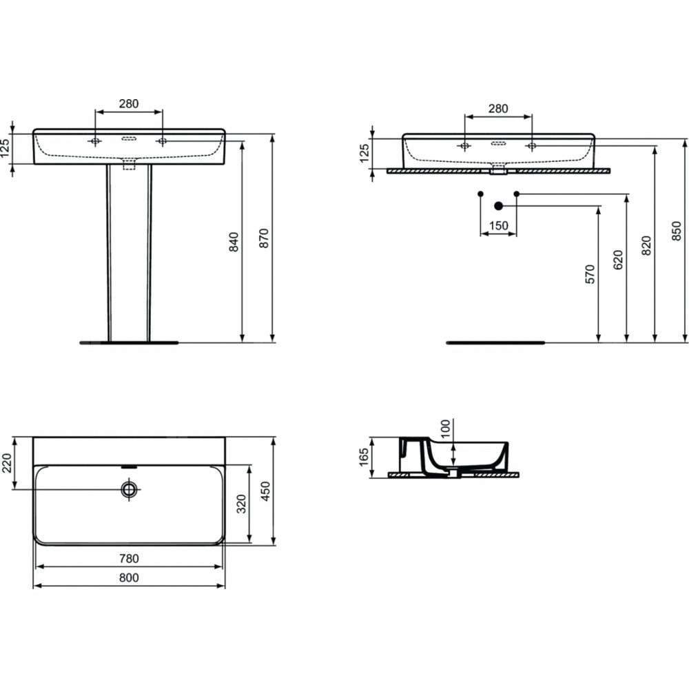 Umywalka Conca mocowana do ściany z przelwem (kształt szczelinowy), bez otworu na baterię.