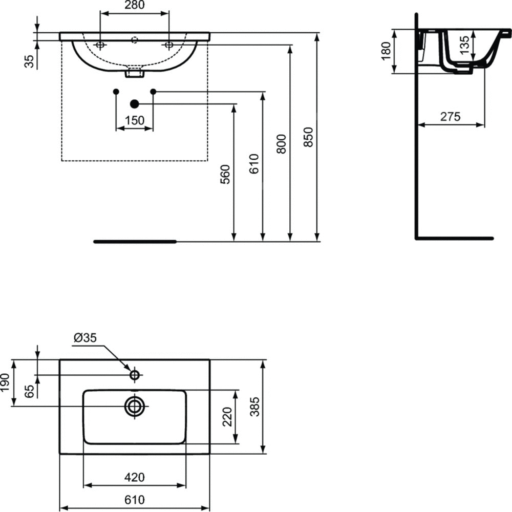 Umywalka Ideal Standard i.life S kompaktowa z powierzchniami bocznymi (krótki wysięg) - tylko 38,5 cm. Z centralnym wybitym otworem na baterię oraz z przelewem. Do montażu z małym postumentem T4714 lub małym pólpostumentem T4715 albo samodzielnie z syfonem.