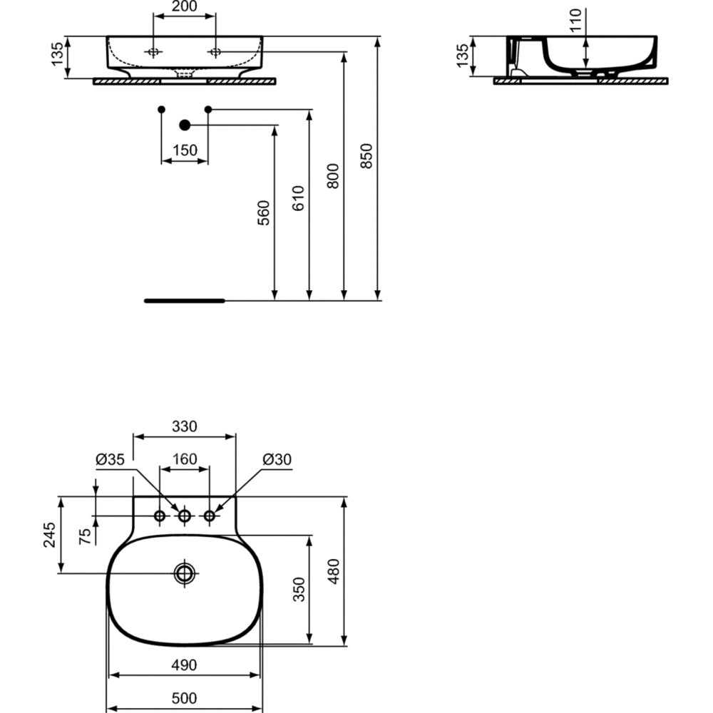 Umywalka Linda-X wisząca do montażu na meblach lub blacie (szlifowany spód). Z 3 wybitymi otworami na baterię, bez przelewu. W komplecie szablon do wycinania TT0299731.