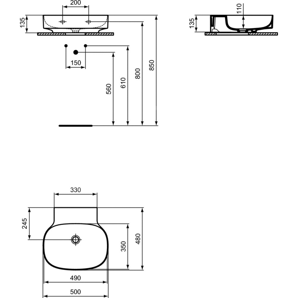 Umywalka Linda-X do montażu na meblach lub blacie (szlifowany spód). Bez otworu na baterię oraz bez przelewu. W komplecie szablon do wycinania TT0299731.