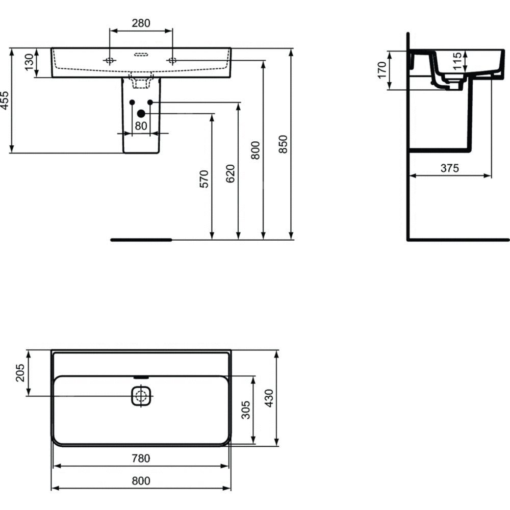 Umywalka Strada II bez otworu na baterię, z przelewem o szczelinowym kształcie oraz korkiem o białej pokrywie. Do montażu z meblami, półpostumentem T299601 lub samodzielnie z syfonem. Opcjonalny montaż z korkiem typu Click-clack z metalową pokrywą T3629AA. Zalecane wyposażenie: zestaw montażowy M10 x 140 mm.