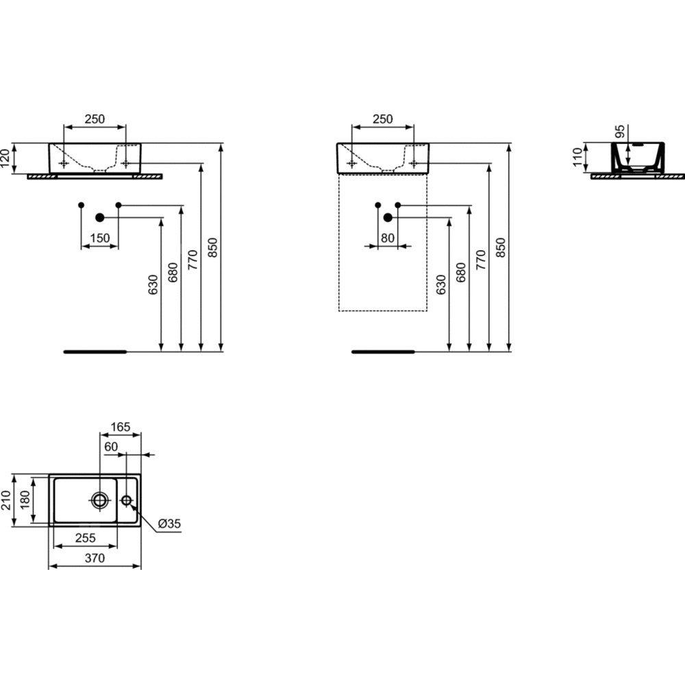 Umywalka do mycia rąk 37 cm. Otwór na baterię po prawej stronie. Otwór na baterię po prawej lub lewej stronie. EN 14688. Mocowana do ściany. Do skompletowania z syfonem. Zalecane dodatkowe elementy: - Zestaw montażowy M8 x 90 mm K714467. Syfon G1 1/4 - typowy A2305AA. Przyłącze kątowe (dopływ G1/2, bateria 10mm/G3/8) B7883AA. Rozeta do syfonu G1 1/4 (w przypadku montażu baterii bez korka) B4801AA.