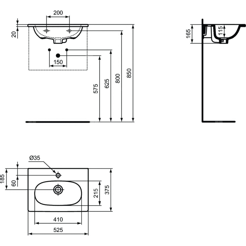 Umywalka Tesi 50 cm z powierzchniami bocznymi - krótki wysięg - 1 otwór na baterię.