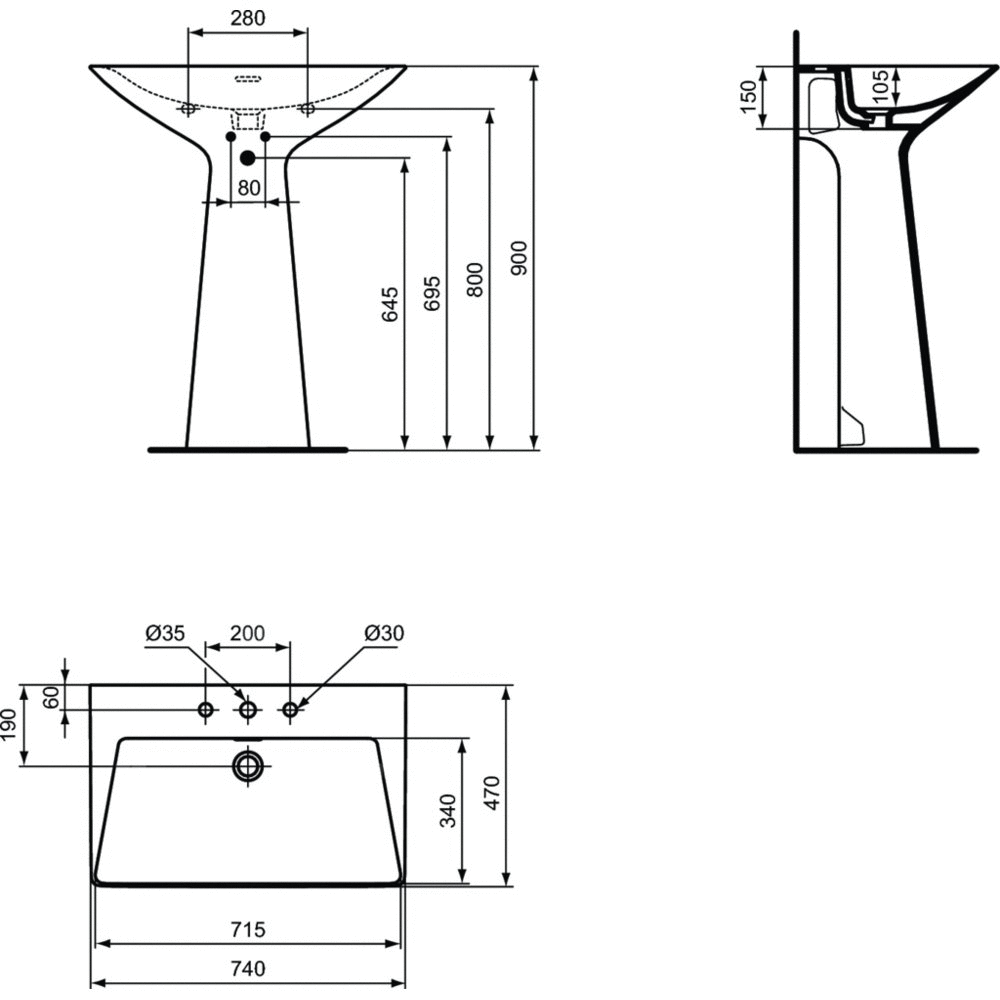 Jednoczęściowa stojąca umywalka Tipo-Z z wybitymi 3 otworami na baterię oraz przelewem (kształt szczelinowy).
