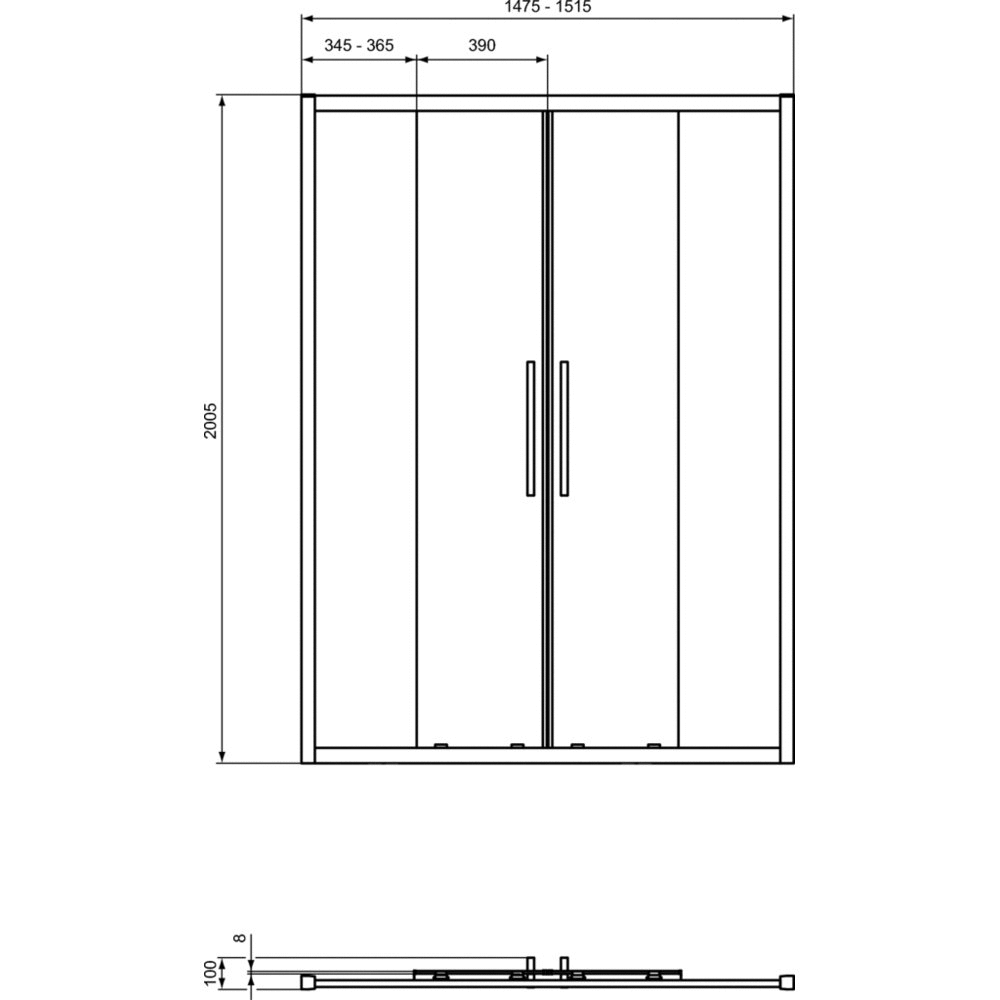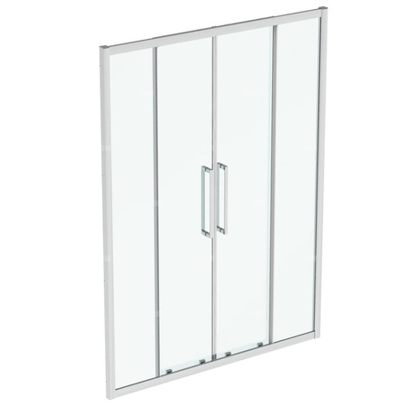 Dwoje drzwi prysznicowych przesuwnych z dwoma panelami bocznymi. Wykonane z bezpiecznego transparentnego szkła 8 mm z powłoką Ideal Clean zabezpieczającą przed osadzaniem się kamienia. Profile aluminiowe o grubości 1,2 mm. Rozciągliwość 20 mm na profil. Zastosowanie systemu podwójnych kółek na górze z systemem szybkiego zamykania na dole. Brak mechanizmu samodomykania "soft close". Przeznaczony do montażu we wnęce (ściana do ściany) lub w narożniku (z panelem bocznym typu L). Do montażu z brodzikami Ideal Standard lub bezpośrednio na płytkach. Wszystkie produkty z linii są odwracalne. Więcej informacji oraz rekomendowanych rozwiązań znajduje się w katalogu lub cenniku.
