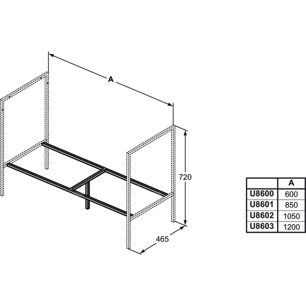 Półka ramy nośnej 60 cm do montażu stojącego, do łączenia z nogami ramy nośnej. Zestaw montażowy w komplecie. Przeznaczone do kompletowania z nogami ramy nośnej do montażu stojącego z konsolą pod umywalkę i blatem.