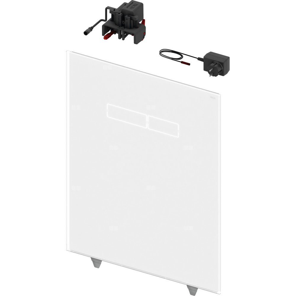 Górna obudowa szklana do modułu TECElux z elektroniczną funkcją uruchamiania "sen-Touch" wraz z elementami montażowymi. W tym zasilacz wtykowy (napięcie przyłączeniowe 230 V) z silnikiem do podwójnego spłukiwania.