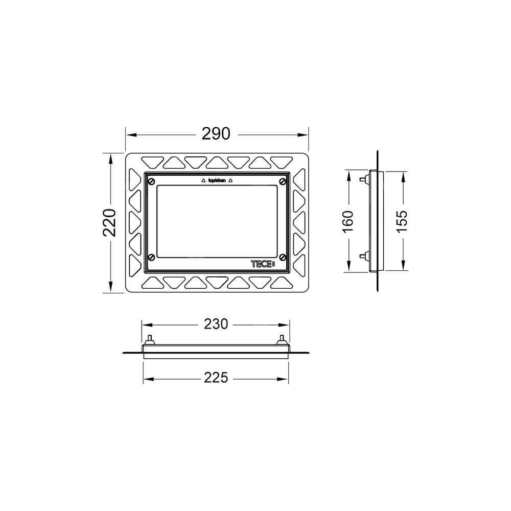 Zestaw instalacyjny do zabudowy mokrej do montażu przycisków spłukujących do WC TECEloop szkło, TECEloop tworzywo, TECEvelvet, TECEsquare szkło, TECElux mini oraz TECEnow. Ramka montażowa z zakresem regulacji głębokości montażu płytek od 5 do 18 mm (ze śrubami regulacyjnymi o zakresie regulacji 18–33 mm – nr katalogowy 9820181). W komplecie narzędzia do demontażu przycisków spłukujących.