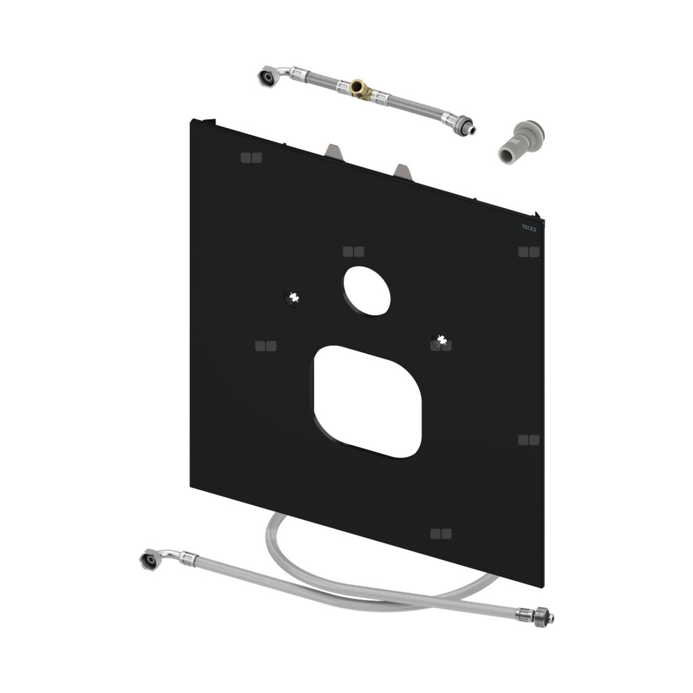 Dolna obudowa szklana do łączenia z toaletą myjącą Duravit SensoWash C oraz Slim lub V & B ViClean L, w tym samoprzylepna taśma wygłuszająca, wymienny długi wąż przyłączeniowy do spłuczki oraz adapter z tworzywa 3/8" do zaworu napełniającego F 10.