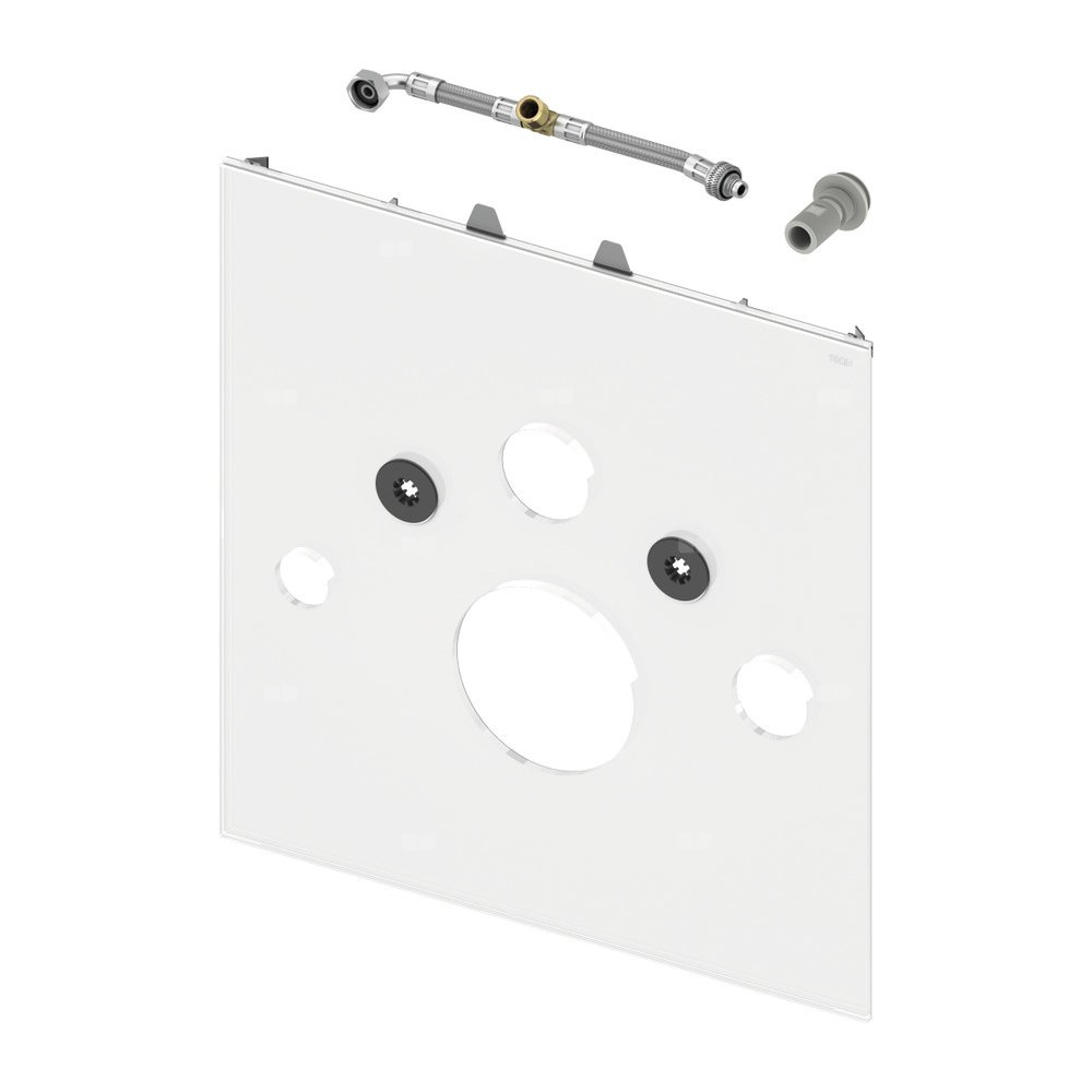 Dolna obudowa szklana do łączenia z toaletą myjącą TOTO Neorest AC i EW lub Geberit AquaClean 8000/8000plus, w tym samoprzylepna taśma wygłuszająca, wymienny wąż przyłączeniowy do spłuczki oraz adapter z tworzywa 3/8" do zaworu napełniającego F 10.