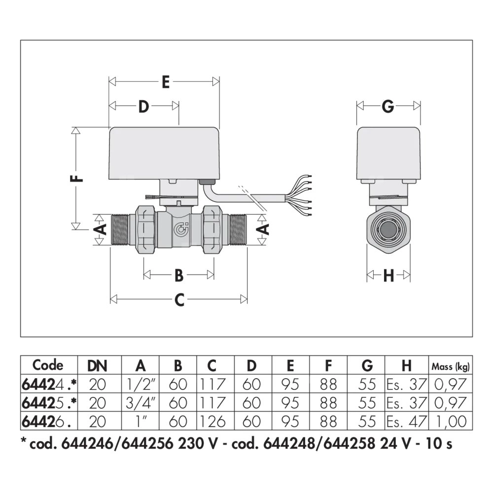 Dwudrożny, zawór kulowy z napędem Z mikroprzełącznikiem pomocniczym Z siłownikiem ze sterowaniem 3-punktowym Przyłącze: G 1/2" A (ISO 228-1) GZ. Maksymalne ciśnienie pracy: 10 bar. Zakres temperatury medium: -5–110 °C. Zakres temperatury otoczenia: 0–55 °C. Zasilanie elektryczne: 230 V (AC). Pobór mocy: 4 VA. Stopień ochrony: IP 44 (w pozycji pionowej), IP 40 (w pozycji poziomej). Długość przewodu zasilająego: 1 m. Styk mikroprzełącznika pomocniczego (230 V): 0,8 A. △p max.: 10 bar. Kv: 11,1 m³/h. Czas zadziałania: 40 s (obrót 90°).