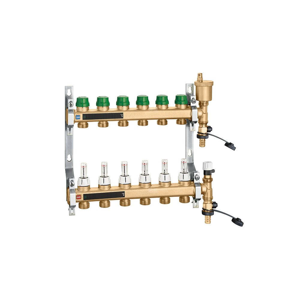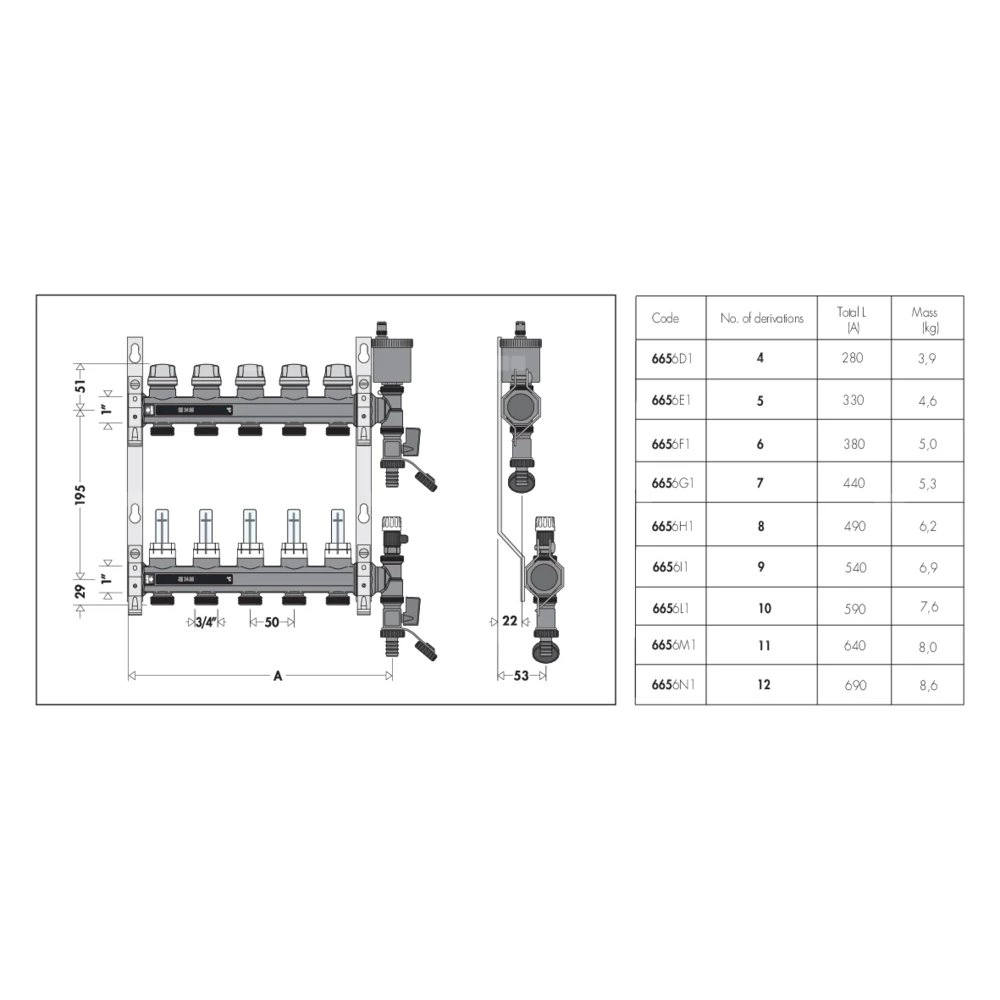 Zespół rozdzielaczy Zawiera: - rozdzielacz powrotny z wkładkami równoważącymi DYNAMICAL® przystosowanymi do współpracy z siłownikami elektrotermicznymi, zakres regulacji 25÷170 l/h; - rozdzielacz zasilania z przepływomierzami; - zakończenie rozdzielacza z automatycznym odpowietrznikiem z kapturkiem higroskopijnym i zaworem spustowym; - stalowe uchwyty montażowe do zastosowania w skrzynkach lub bezpośrednio na ścianie. główne podłączenie: G 1" (ISO 228-1) GW, Podłączenie do złączek Caleffi. przyłącza wylot: G 3/4" A (ISO 228-1) GZ, 12 wyjść. Maksymalne ciśnienie pracy: 6 bar. Zakres temperatury medium: 5–60 °C. Rozstaw wyjść: 50 mm. Zakres regulacji natężenia przepływu: 25–150 l/h.