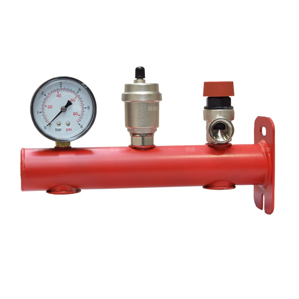 Grupa bezpieczeństwa 3 bar z wyposażeniem (z manometrem, zaworem bezpieczeństwa 3 bar i automatycznym odpowietrznikiem)