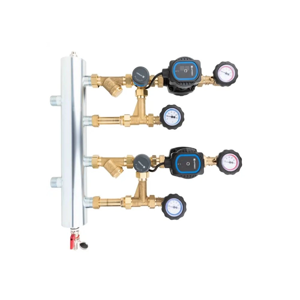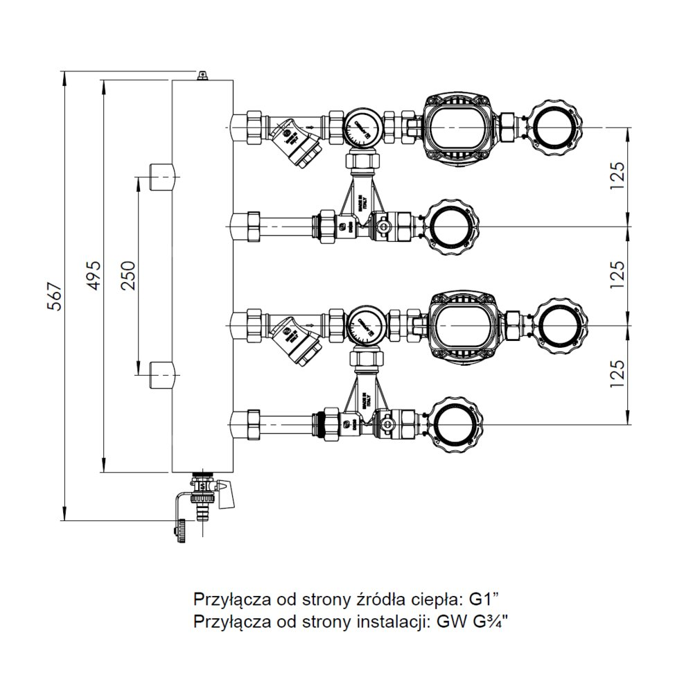 - Zawory odcinające ze zintegrowanymi termometrami do kontroli temperatury medium na każdym przyłączu.