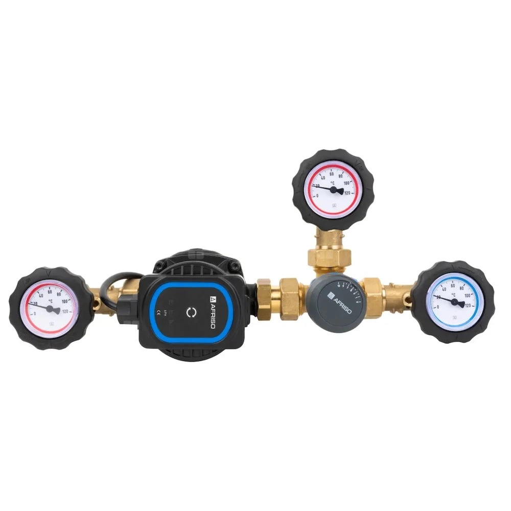 - Zawory odcinające ze zintegrowanymi termometrami do kontroli temperatury medium na każdym przyłączu.