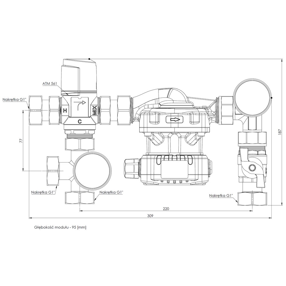 - Wyposażony w termostatyczny zawór mieszający ATM 561. Zawór utrzymuje temperaturę zasilania ustawioną na pokrętle w zakresie 20-43°C.