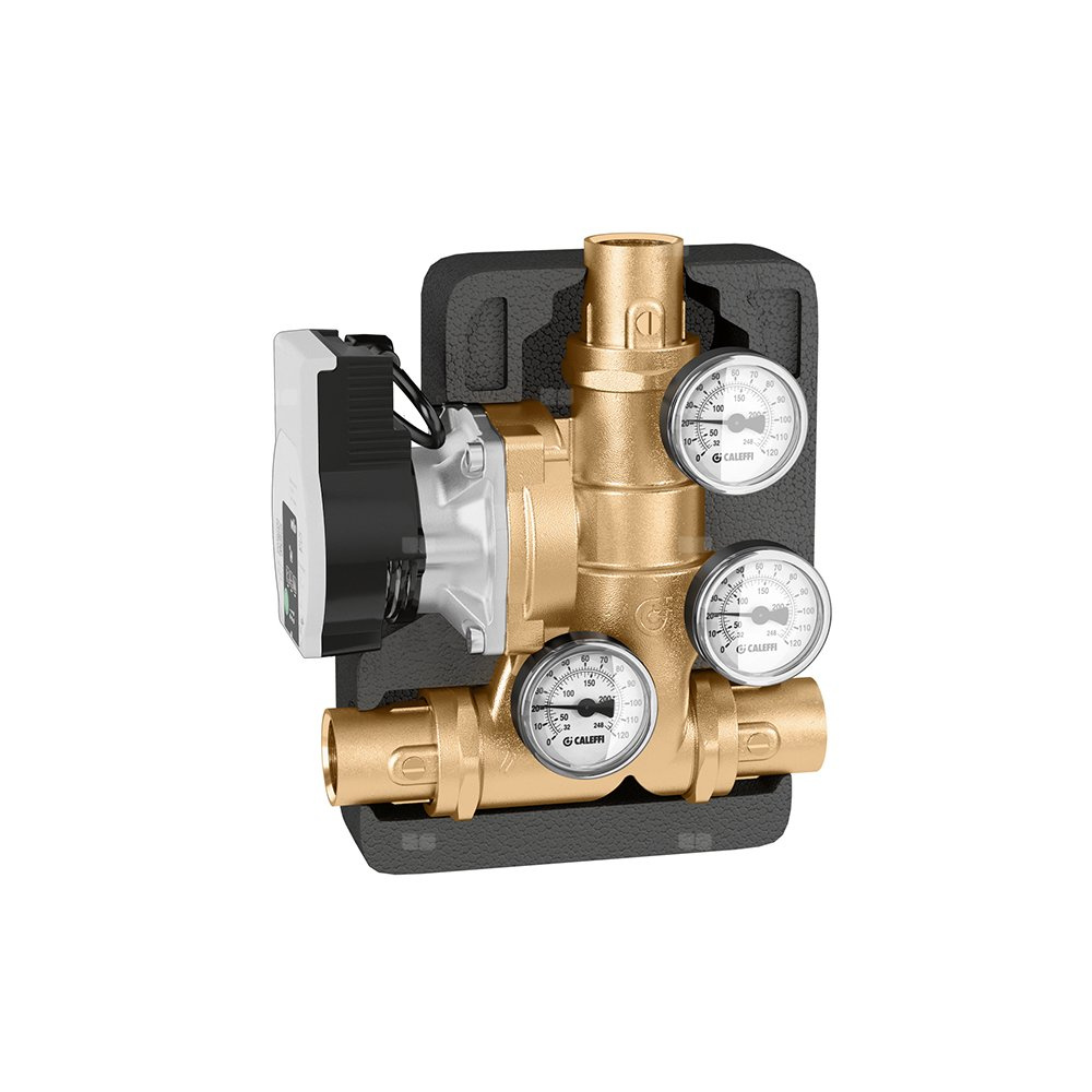 Grupa pompowa do cyrkulacji czynnika grzewczego z zaworem termostatycznym zabezpieczającym kotły na paliwo stałe przed zbyt niską temperaturą.