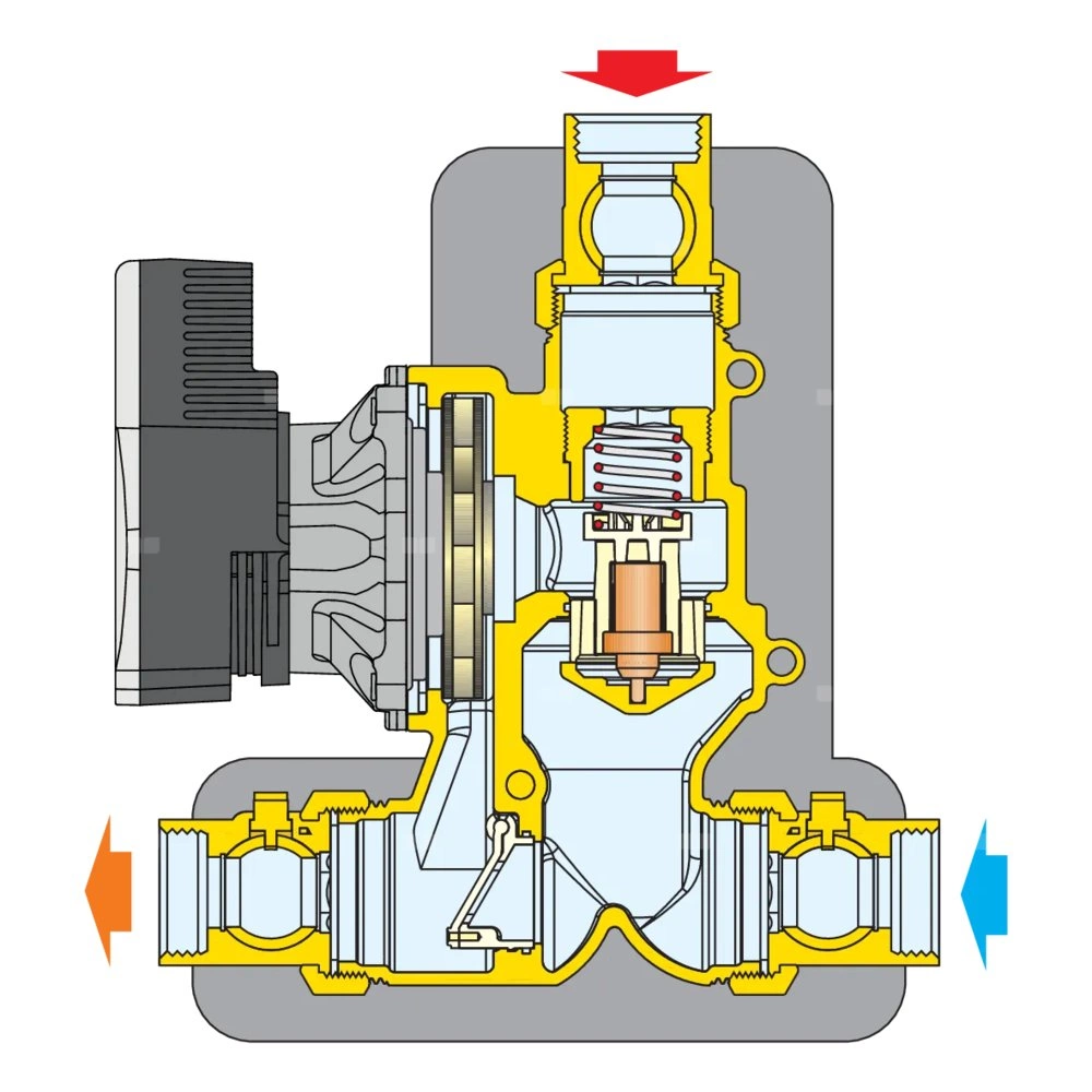 Grupa pompowa do cyrkulacji czynnika grzewczego z zaworem termostatycznym zabezpieczającym kotły na paliwo stałe przed zbyt niską temperaturą powrotu Z izolacją. Temperatura pełnego zamknięcia obejścia: Tmin = Tset +10°C = Tr. Pompa o wysokiej wydajności: UPM3S Auto 25-60, UPML 25-105. Przyłącze: G 1 1/4" (ISO 228-1) GW, złączka. Maksymalne ciśnienie pracy: 10 bar. Zakres temperatury medium: 5–100 °C. Nastawa: 60 °C. Maksymalne stężenie glikolu: 50 %. Medium: Roztwory glikolu, woda. Maksymalne zalecane natężenie przepływu: 2 m³/h. DN: DN 25 (korpus). Rodzaj pompy: Para 15-7. Materiał: mosiądz.