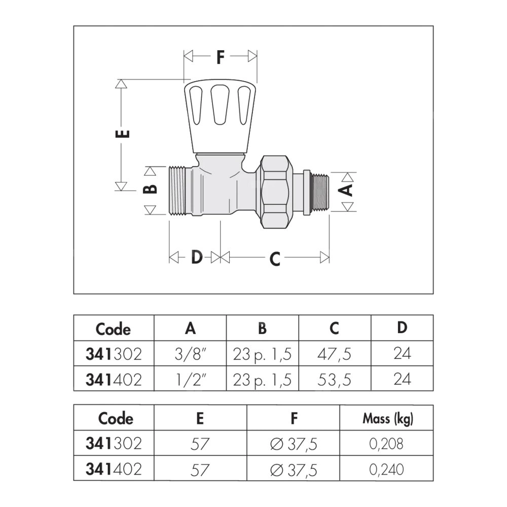Prosty ręczny zawór grzejnikowy. podłącznie rury: 23 p. 1,5, wlot, podłączenie proste, Podłączenie do złączek Caleffi. podłączenie grzejnika: G 3/8" A (ISO 228-1) GZ, wylot, podłączenie proste. Maksymalne ciśnienie pracy: 10 bar. Zakres temperatury medium: 5–100 °C. Wykończenie: chromowane. Kv: 1,32 m³/h. Materiał: mosiądz.
