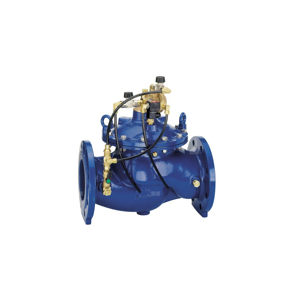 Przy braku ciśnienia zawór jest zamknięty. Po otwarciu dopływu wody do zaworu, wzrastające ciśnienie podnosi grzyb i otwiera zawór– woda przepływa do części wylotowej. Jeśli pilotowy zawór elektromagnetyczny jest zamknięty (przy braku napięcia w wersji NZ), woda z części wlotowej dostaje się do komory nad przeponą. Poddana wpływowi ciśnienia wlotowego powierzchnia przepony jest większa od powierzchni grzyba zaworu w związku, z czym siła działająca na przeponę jest większa od siły działającej na grzyb – zawór zamyka się. Po podaniu napięcia na cewkę, zawór pilotowy otwiera się , a woda z przestrzeni nad przeponą wypływa na zewnątrz. Ciśnienie w komorze spada i grzyb podnosi się, otwierając zawór.