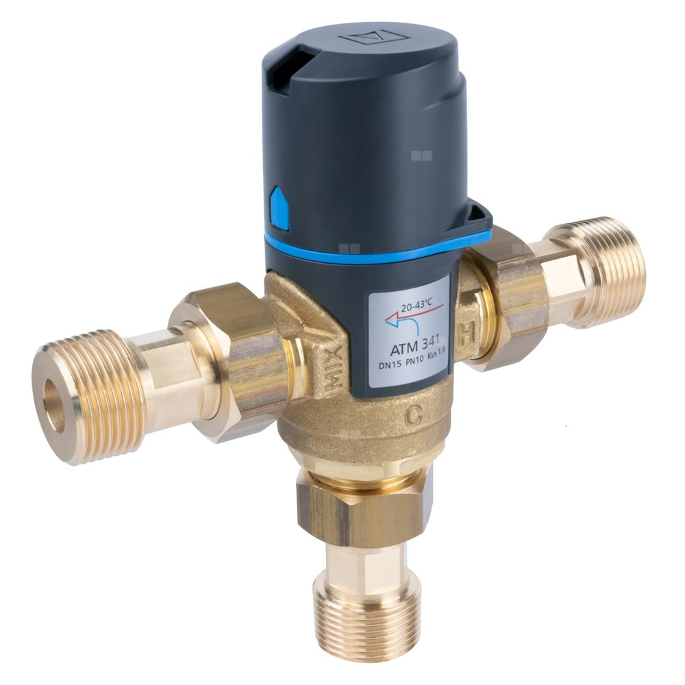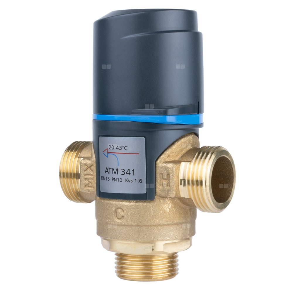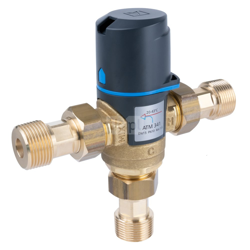 Zawór regulacyjny termostatyczny do wody ciepłej AFRISO ATM 341 ze śrubunkami mosiądz GZ 3/4'', DN 15, zakres temp. 20-43'C, Kvs 1.6 m3/h, maksymalna temperatura 90'C, maksymane ciśnienie 10 bar