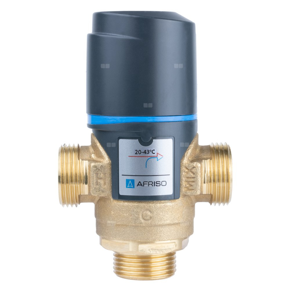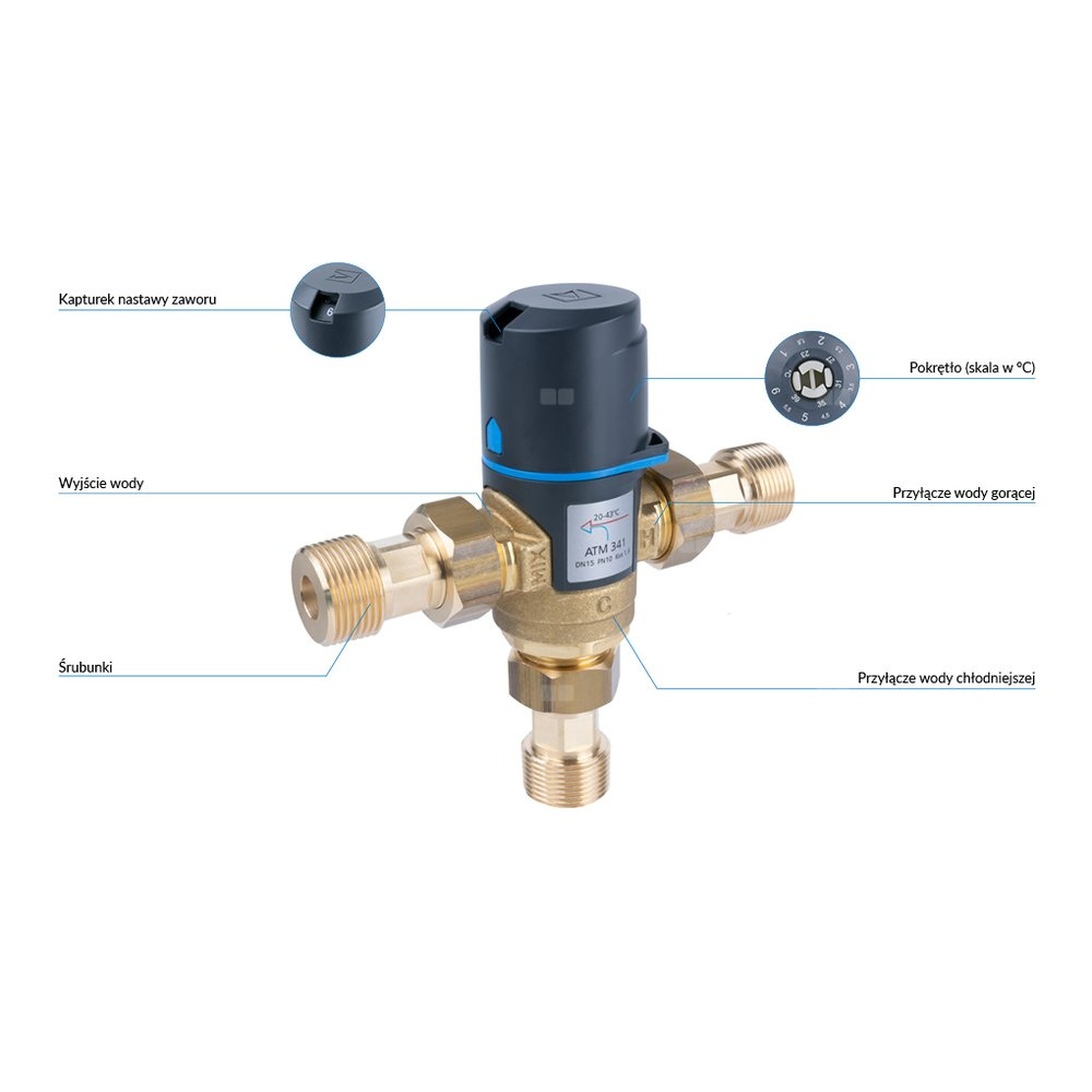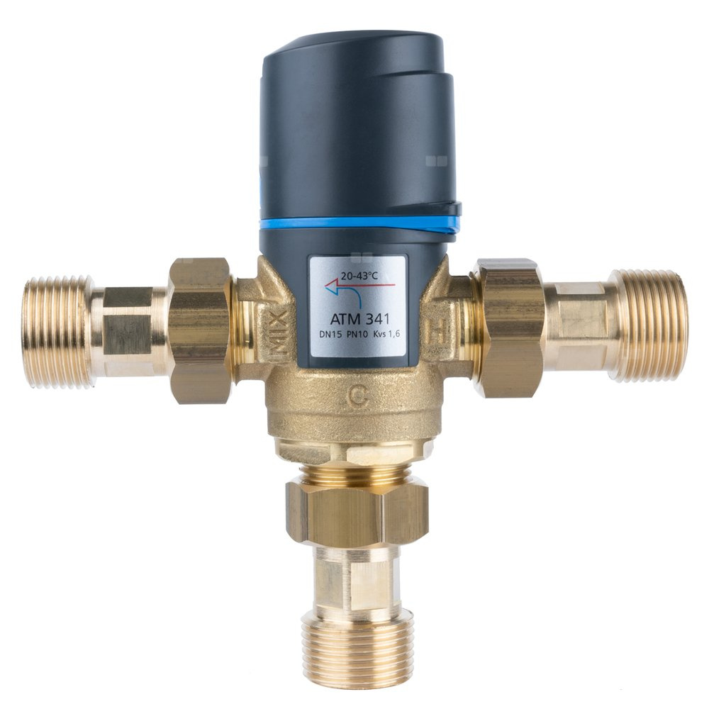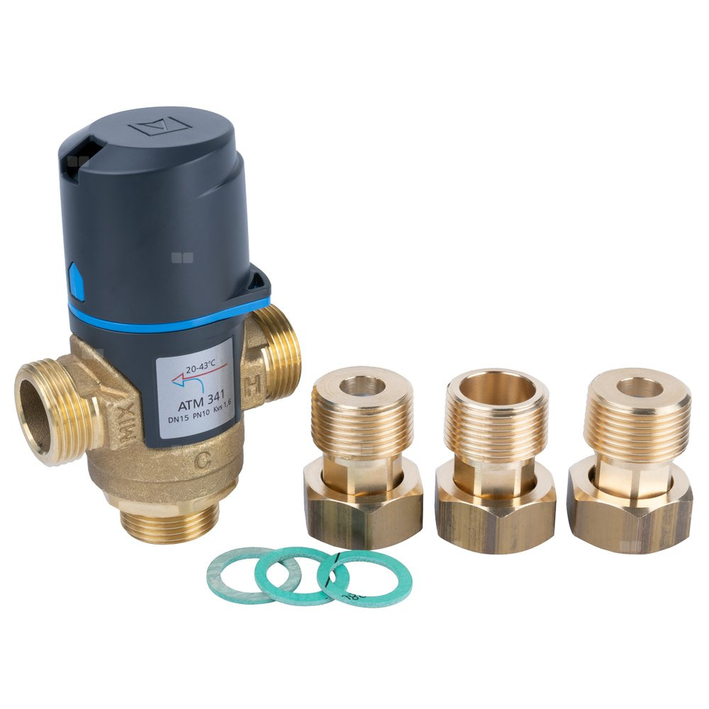 Zawór regulacyjny termostatyczny do wody ciepłej AFRISO ATM 341 ze śrubunkami mosiądz GZ 3/4'', DN 15, zakres temp. 20-43'C, Kvs 1.6 m3/h, maksymalna temperatura 90'C, maksymane ciśnienie 10 bar