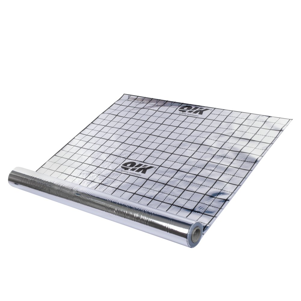 Folia izolacyjna QIK eco wykonana jest jako laminat folii polietylenowej i polipropylenowej dodatkowo metalizowanej aluminium. Dostarczana w rolce o szerokości 102 cm. Grubość folii wynosi 0,105 mm. Cenę podano z 1 mb.